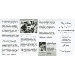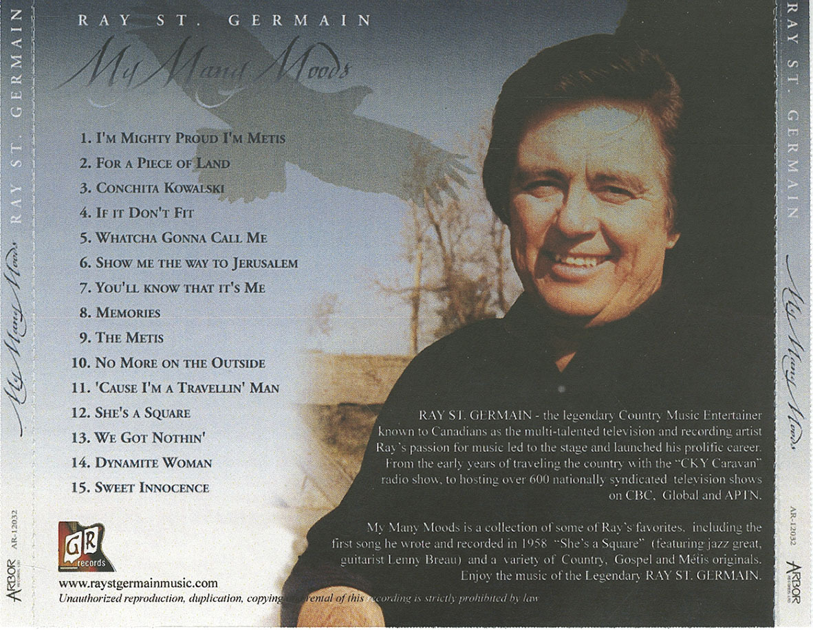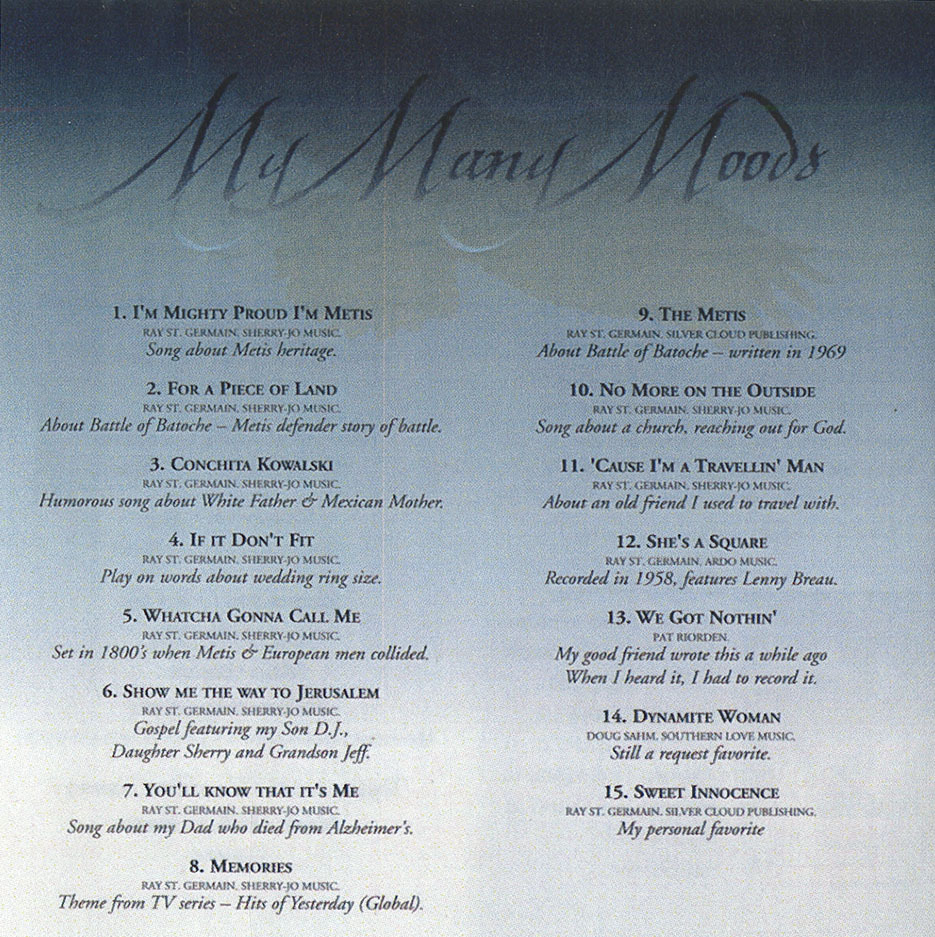 "My Many Moods" came about when I was asked what kind of CD would I be releasing. I enjoy all kinds of music, though I mostly sing and write Country and Gospel. I especially like to write songs about my Metis heritage. This CD has the original recording of the first song I ever wrote & recorded, "She's a Square" in 1958, and features jazz guitar legend, Lenny Breau. It also holds some of the latest songs I've written. So, this CD contains a little of everything that I like to write or sing about when the mood strikes me. Enjoy!