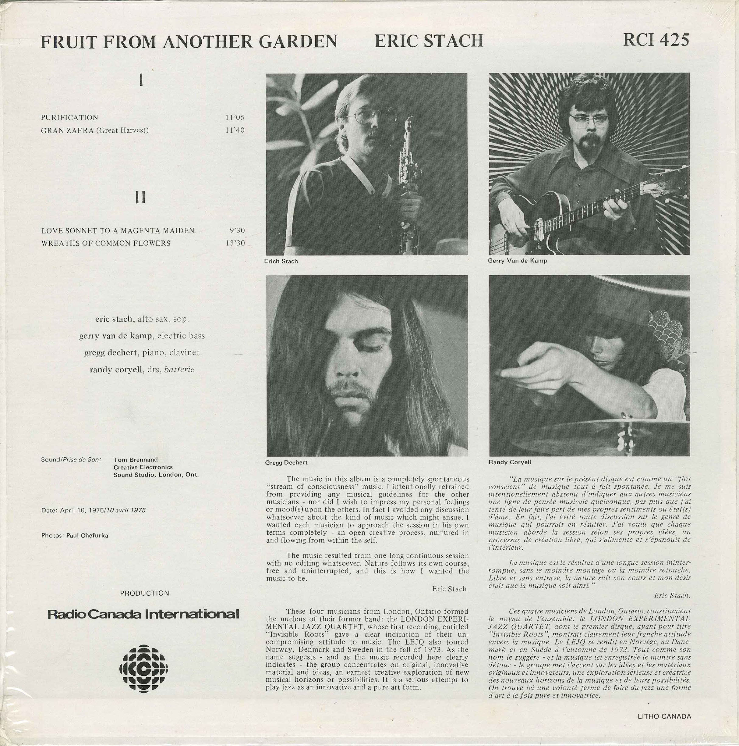 These four London, Ontario musicians previously formed the core of the London Experimental Jazz Quartet (LEJQ), whose debut recording Invisible Roots established their uncompromising approach to original, exploratory jazz. As LEJQ, the group toured Norway, Denmark, and Sweden in the fall of 1973. Fruit From Another Garden continues that exploratory trajectory, emphasizing innovation, originality, and jazz as a serious and pure art form.