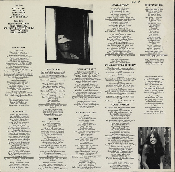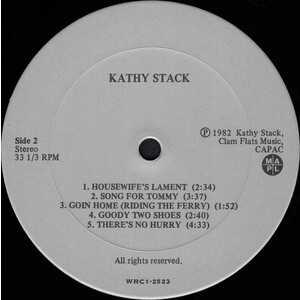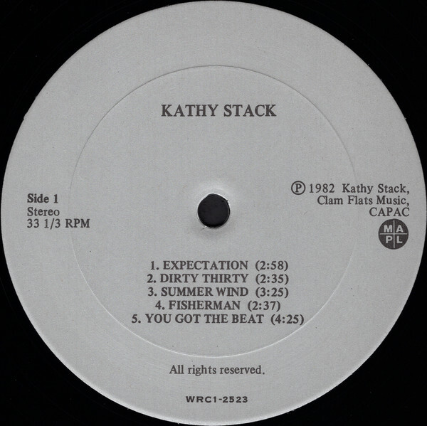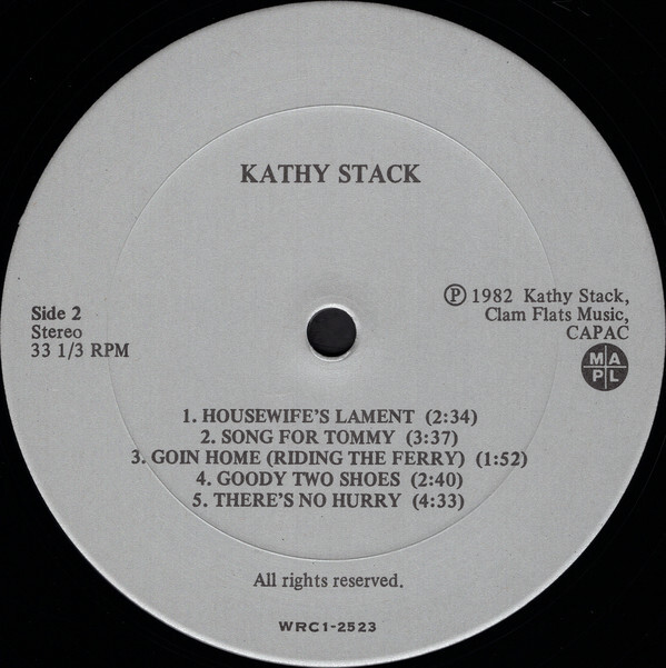 In 1973, she released a rare promotional 7″ single on the Haida label, Expectations b/w Even in the Rain, produced by Claire Lawrence. Nearly a decade later, Stack self-released her only full-length vinyl LP in 1982, recorded on Salt Spring Island and now considered a sought-after Canadian private press gem, blending introspective folk with subtle shades of funk and jazz.