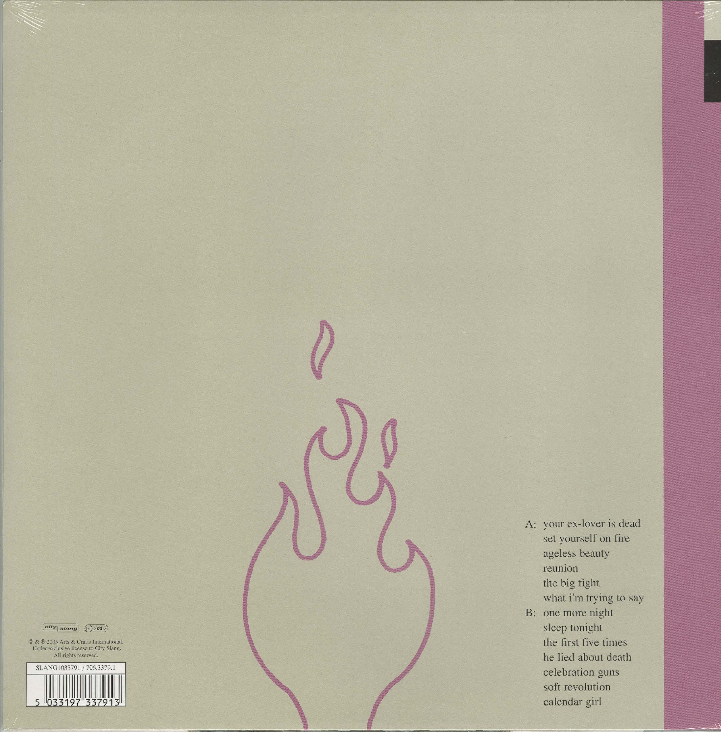 Set Yourself on Fire is about breaking up and breaking down, and as such the album feels wontedly cathartic, like the moments right after you hit your emotional nadir and start getting your shit together. Stars handle the mood delicately with few slip-ups; my only complaint is that they never handle much of anything else. Save "The Big Fight"-- which is tame, slow and lounged-out-- there's no controversy, only half-smiles and the soggy aftermath. But even the dearest numbers have faint, nagging undercurrents. The band make no effort to avoid the inevitable charges of over-sentimentality; in fact, they indulge the calls: "The cold is a vindictive bride," reads their website bio, "she'll trap you between her thighs and turn your heart to ice if you're not careful." Despite overblown romanticism run rampant, Stars somehow remain understated. It's the "Soft Revolution", as the terrific penultimate track declaims. Hop aboard.