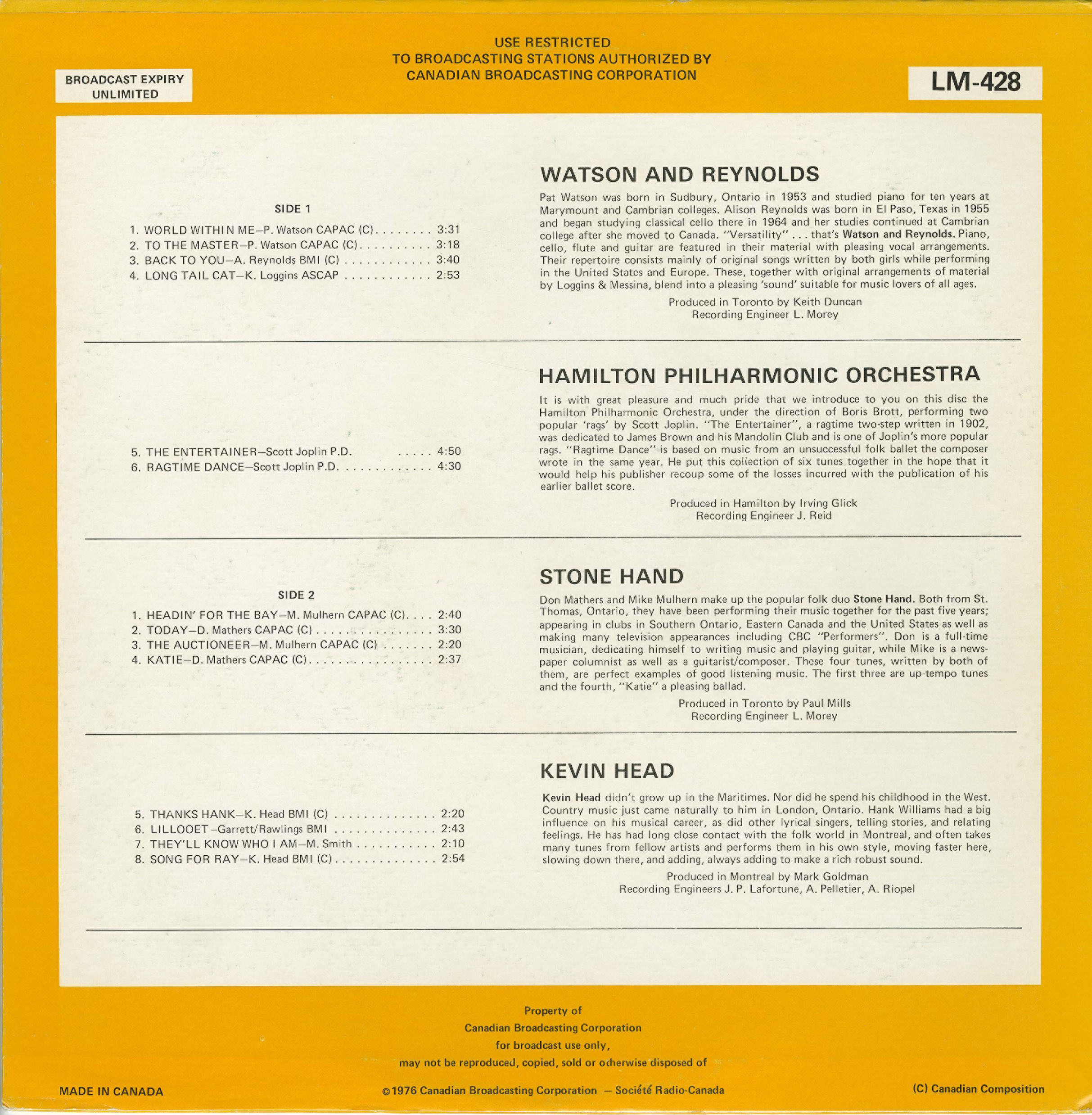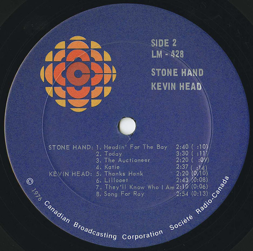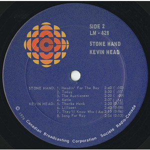 Don Mathers and Mike Mulhern make up the popular folk music duo Stone Hand. Both from St. Thomas, Ontario, they have been performing their music together for the past five years; appearing in clubs in Southern Ontario, Eastern Canada and the United States as well as making many television appearances including CBC "Performers'. Don is a full-time musician, dedicating himself to writing music and playing guitar, while Mike is a news-paper columnist as well as a guitarist/composer. These four tunes, written by both of them, are perfect examples of good listening music. The first three are up-tempo tunes and the fourth, "Katie" a pleasing ballad.