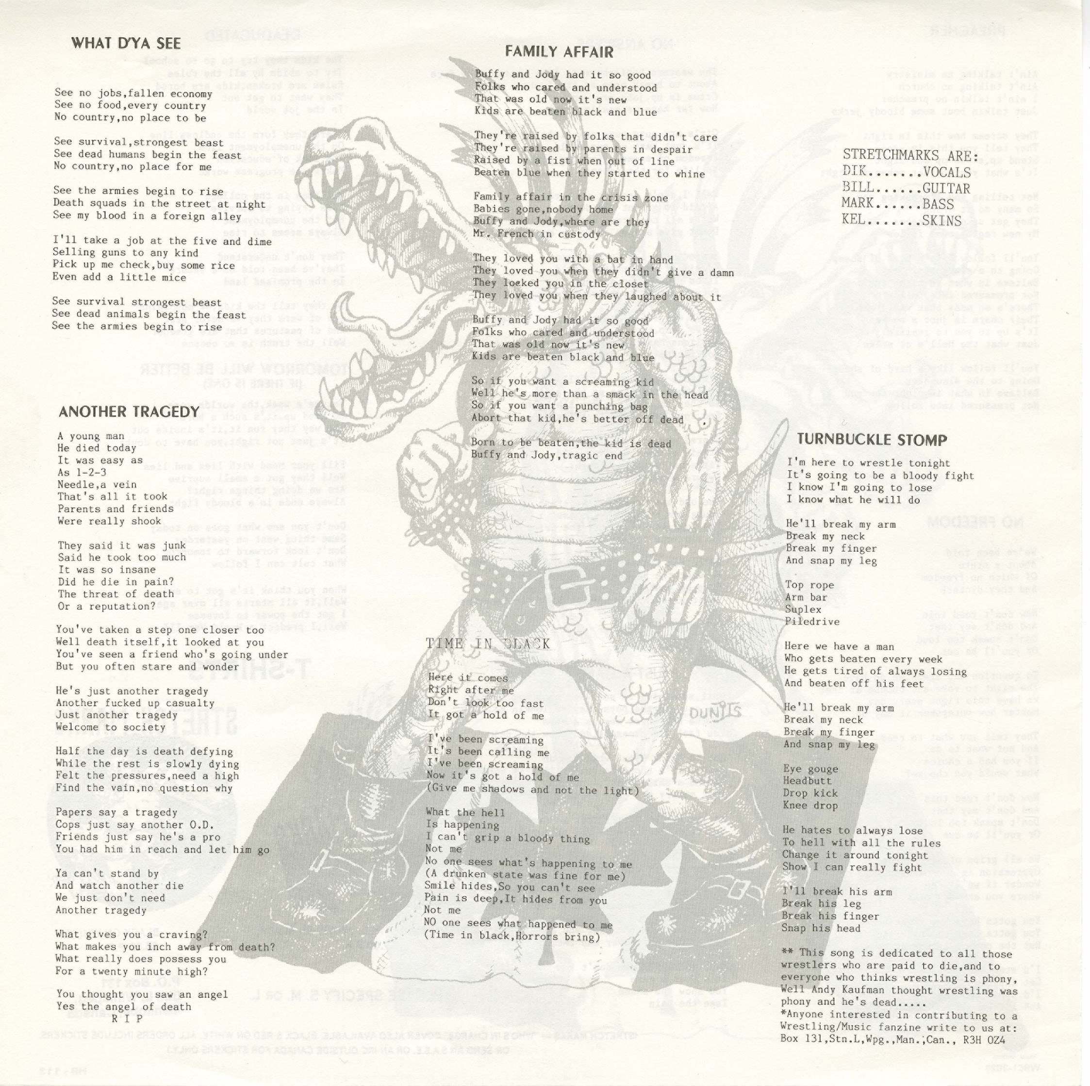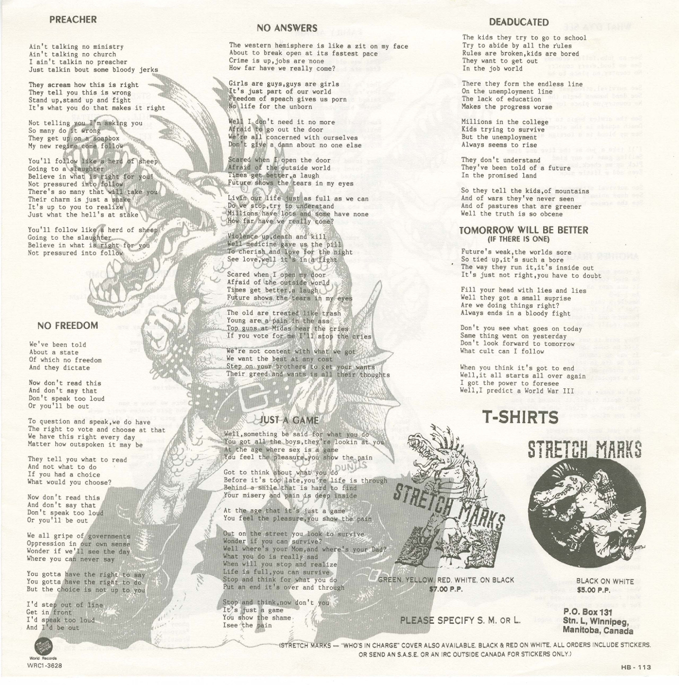Stretch Marks emerged from Winnipeg in the early 1980s as one of the most ferocious, disciplined, and outward-looking bands to rise from Canadaâs first hardcore wave. At a time when Winnipeg unexpectedly became a breeding ground for uncompromising punkâalongside Personality Crisis, Artificial Life, Beach Mutants, Lowlife, Something Evil, and UnwantedâStretch Marks quickly distinguished themselves through speed, precision, and an unusually organized approach that set them apart from many of their peers.