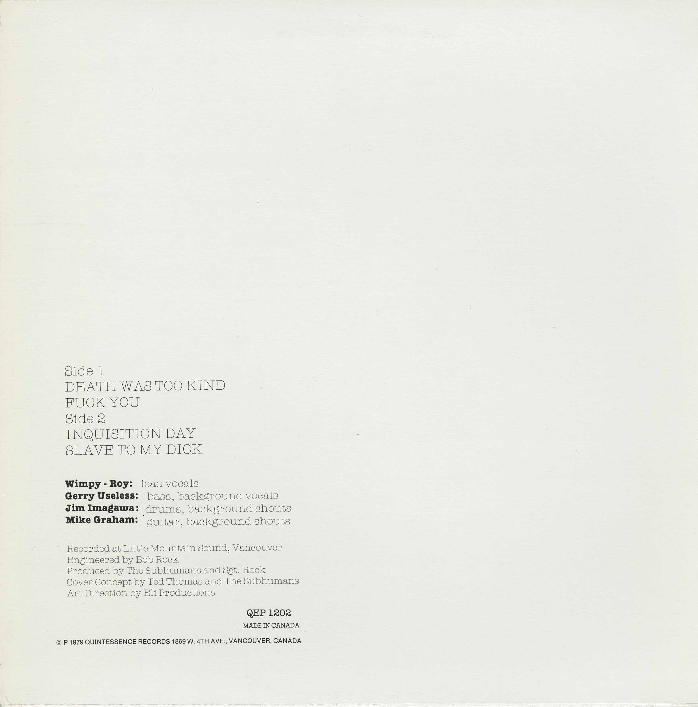 Side two dives into “Inquisition Day,” a darkly urgent warning about creeping authoritarianism, and closes with “Slave to My Dick,” a sharp and self-aware satire on male sexual ego. Both tracks reveal the Subhumans' talent for pairing political edge with brutal humor, delivered through unfiltered punk fury.