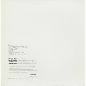 Recorded at Vancouver’s Little Mountain Sound by a then up-and-coming Bob Rock—years before his rise to mainstream fame with Metallica—the EP walks the line between raw immediacy and crisp production. The lineup for this release features Brian “Wimpy Roy” Goble (vocals), Gerry “Useless” Hannah (bass), Mike Graham (guitar), and Jim Imagawa (drums), each bringing ferocity and intent to the studio floor.