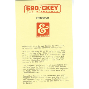 Executive producer for Ampersand was CKEY Program Manager Gene Kirby, and the station has underwritten all costs, including free distribution of copies to all radio stations in Canada."