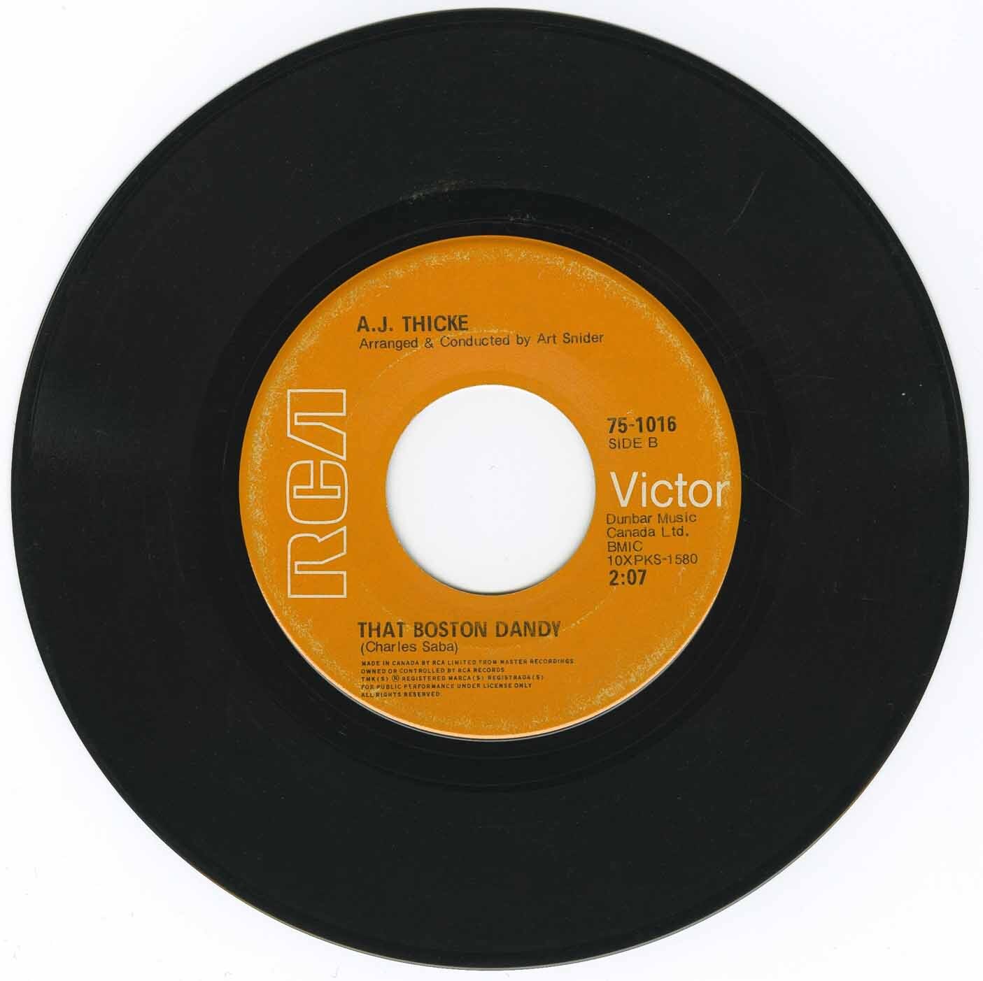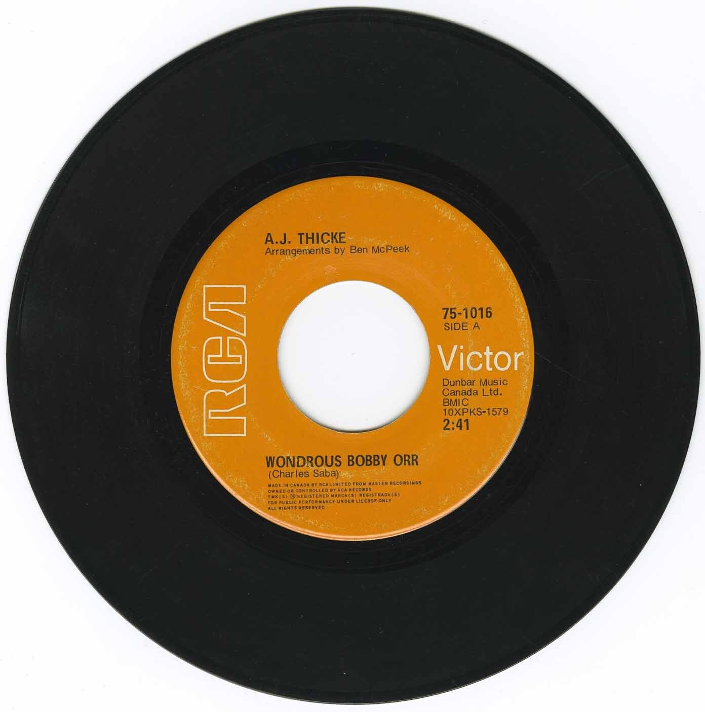 Obscure single featuring the vocal talents of actor Alan Thicke (Thicke Of The Night, Growing Pains) and musical direction from Ben McPeek ("Wonderous Bobby Orr") and Art Snider ("That Boston Dandy") respectively. Ripping guitar work on the McPeek side. A super groovy favourite! However, the best part of the song - aside from the lyrics marveling at Orr's prodigious stick-handling talents, comes at the very end when a female chorus makes some pip-pip noises before the side fades out. It's true. On the flip, Saba elects a more sensual, throaty "talking" style - as if Barry White got a whiff of some helium - while he again lays on some worship for the 'Boston Dandy'. Light a fire, set out a couple snifters of cognac, lie down on that bear-skin rug and throw this on your Radio Shack 'table for some psychotic lovin's with your favorite hockey stick...