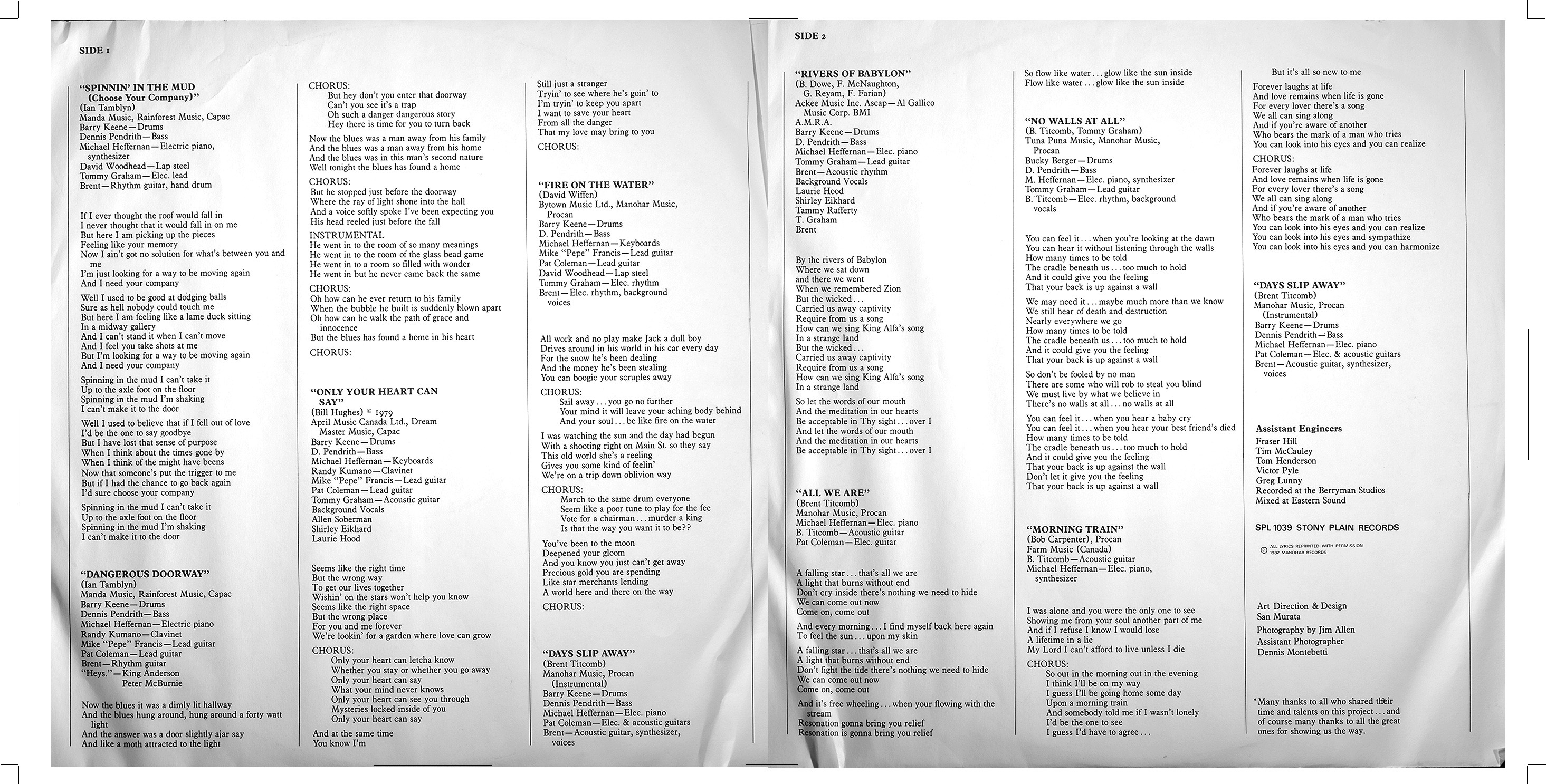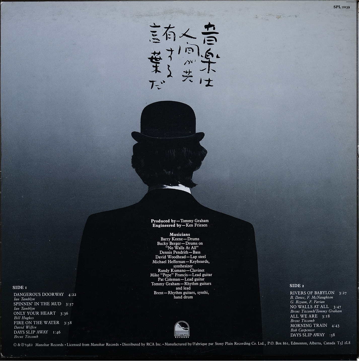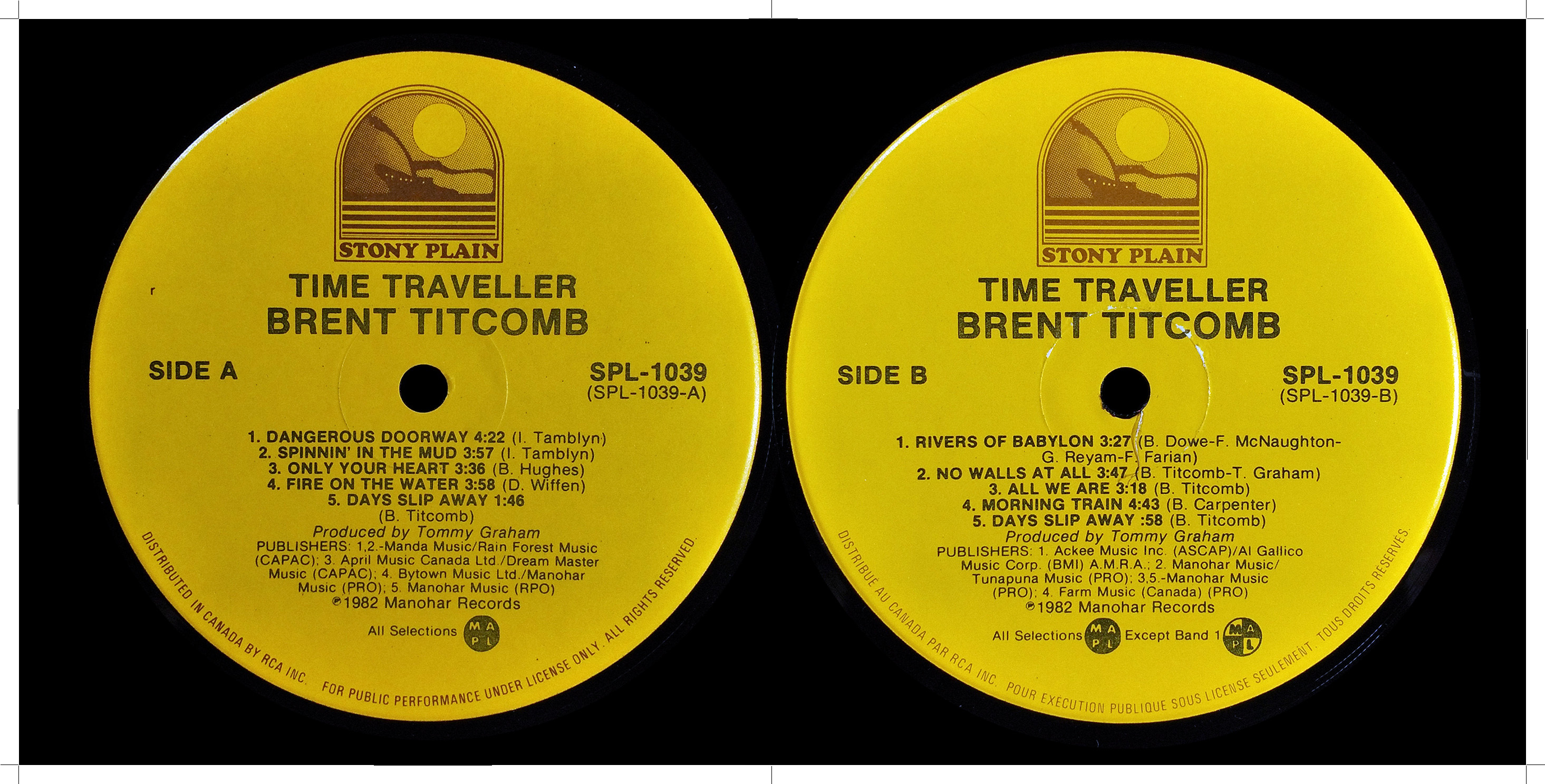 Titcomb’s follow-up, Time Traveller (Stony Plain SPL 1039, 1982), widened his sonic reach. Released through Edmonton’s renowned roots label and distributed nationally by RCA, the album brought a fuller band sound and greater commercial polish, while maintaining his lyrical introspection. Songs like “Dangerous Doorway,” “Fire on the Water,” and “Rivers of Babylon” balanced gentle optimism with philosophical weight, merging folk sensibility with the studio clarity of early ’80s production.