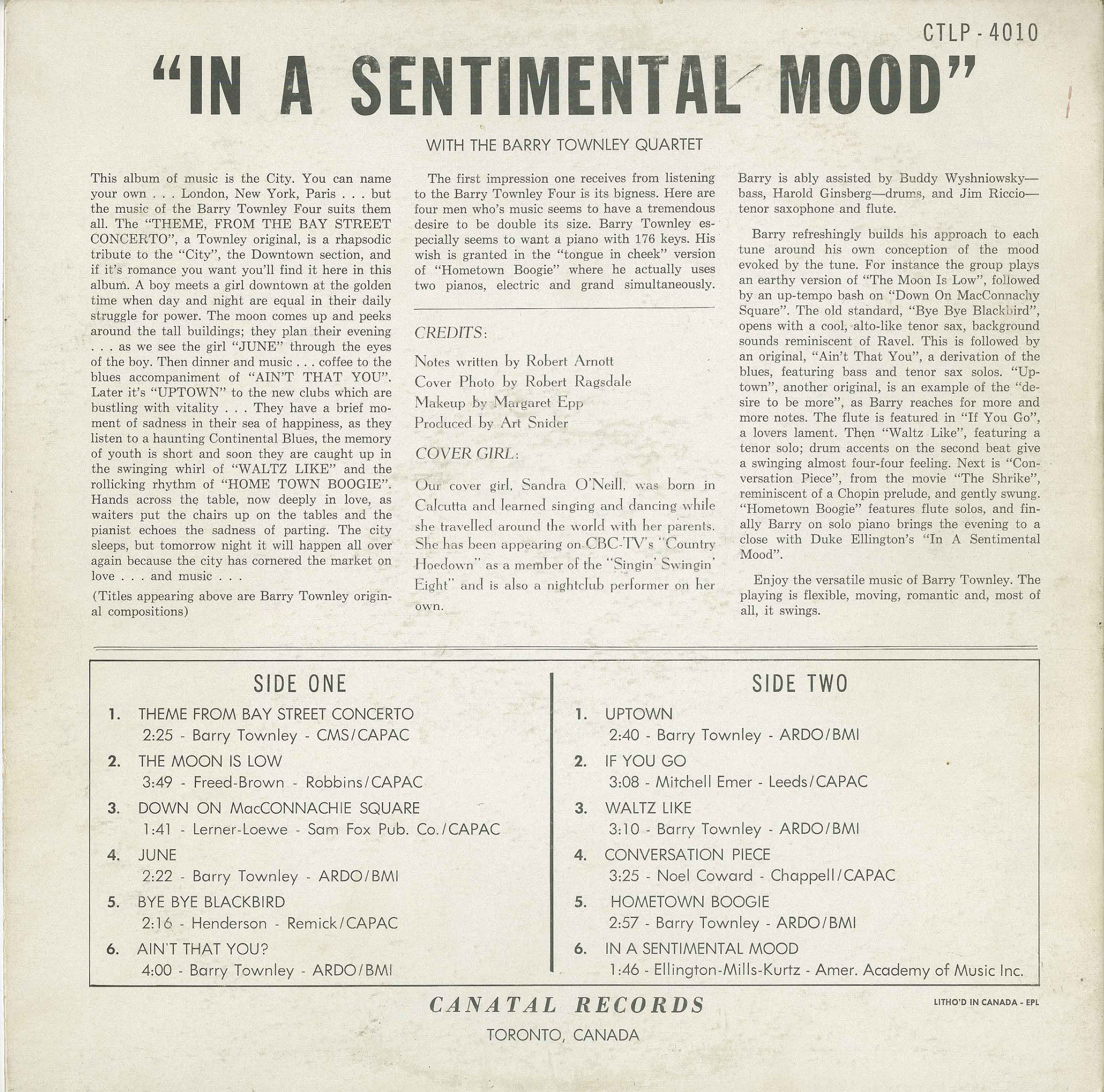 This album of music is the City. You can name your own… London, New York, Paris... but the music of the Barry Townley Four suits them all. The “THEME, FROM THE BAY STREET CONCERTO” (a Townley original), is a rhapsodic tribute to the "City", the Downtown section, and if it's romance you want you'll find it here in this album. A boy meets a girl downtown at the golden time when day and night are equal in their daily struggle for power. The moon comes up and peeks around the tall buildings; they plan their evening… as we see the girl "JUNE" through the eyes of the boy. Then dinner and music ... coffee to the blues accompaniment of "AIN'T THAT YOU". Later it's “UPTOWN" to the new clubs which are bustling with vitality… They have a brief moment of sadness in their sea of happiness, as they listen to a haunting Continental Blues, the memory of youth is short and soon they are caught up in the swinging whirl of "WALTZ LIKE" and the rollicking rhythm of "HOME TOWN BOOGIE'. Hands across the table, now deeply in love, as waiters put the chairs up on the tables and the pianist echoes the sadness of parting. The city sleeps, but tomorrow night it will happen all over again because the city has cornered the market on love…. and music.