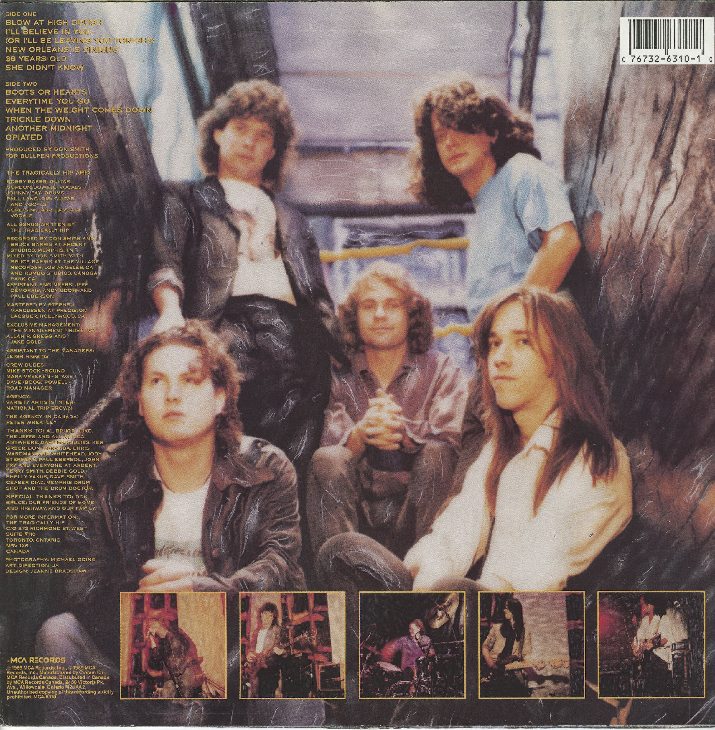 The Tragically Hip's debut album is kind of a wonderful thing to revisit. The band hits the ground running, a rush of mostly unwavering confidence and unfathomable greatness from the first track, "Blow at High Dough," through the fourth, "38 Years Old." But keep listening and hear the future unfold in the record's final seven tracks. The Hip was laying out a map, hinting at what was to come, even if the band didn't know it. The expanse of its ambition can be heard when the Hip deviates from its default blues-rock safe space: the slight countrified amp of "She Didn't Know," the twangy sass of "Boots and Hearts" and the chords on "Trickle Down," which will be heard again on Fully Completely, the band's 1992 breakthrough album.
