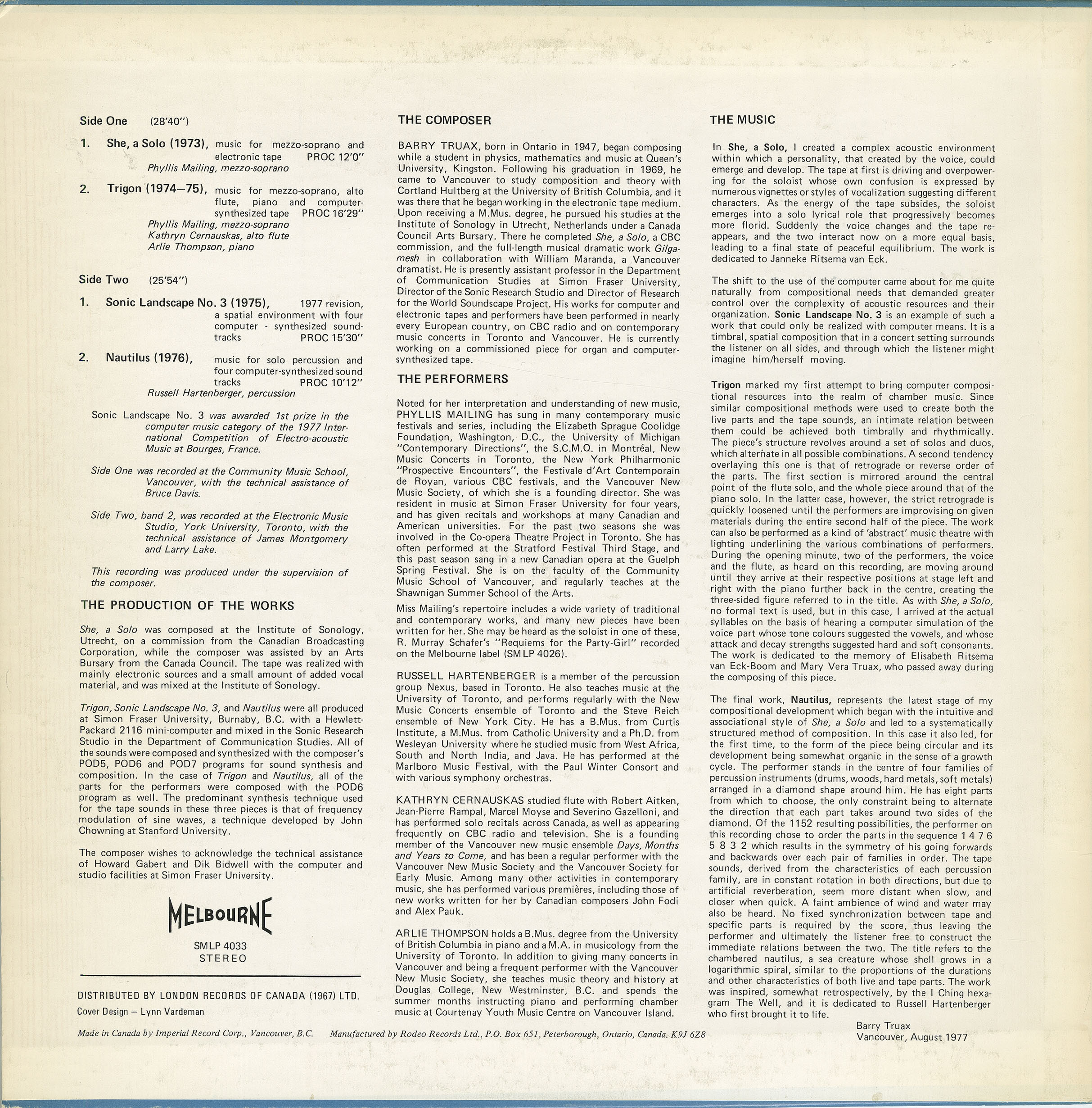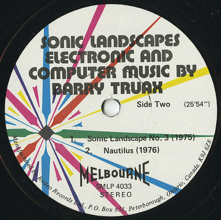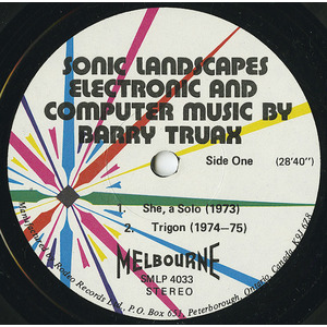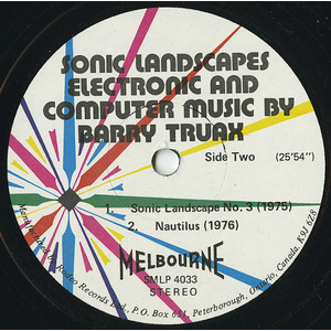 Recording of Barry Truax's Sonic Landscape No. 3 for four computer-synthesized soundtracks. The work is divided into three sections, each of which organizes the timbral and textural component in different ways. Familiar percussion timbres occur in the first section. In the second section, less familiar timbres are introduced in heavier densities such that the interaction of entire groups of timbres and events are perceived. In the final section, individual events are not perceived as much as a single, complex texture composed of related broad-band elements. The work was realized with the composer's POD programs for computer sound synthesis and composition at Simon Fraser University. The synthesis method is that of Chowning's frequency modulation timbral synthesis. The programs run on a Hewlett-Packard 2116 minicomputer with 12-bit D/A converter and digital magnetic tape unit. The sound structures are initially composed interactively with the POD6 program that utilizes real-time monophonic synthesis. The compositional model involves the selection of sound objects to be distributed in a random, Poisson-determined frequency/time field whose density and frequency range are variable in time. For each structure, two or four random variants are calculated and stored; each later occupies a different track on magnetic tape. Most of the sound structures used in the composition are synthesized with the POD7 program for non-real-time synthesis at fixed sampling rate. Envelopes are allowed to overlap in this version, creating a multi-phonic texture. The possibility of digital reverberation allowed by this program is not utilized in this particular composition. Four-channel mixing of the resultant tapes arrives at the final composition. The work, originally realized in 1975, was revised and largely re-synthesized in early 1977 at Simon Fraser University, and mixed in the Sonic Research Studio of the Department of Communication.