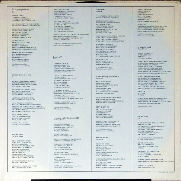 The duo’s debut LP, originally titled Siamese Kiss and later issued simply as Tú, was released in late 1987 on RCA/BMG Music Canada. Combining radio-ready pop with sharp production and dancefloor appeal, the album spawned several singles. The standout hit, “Stay With Me,” became their biggest success, climbing to #8 on the Canadian charts in November 1987. A follow-up single, “The Language of Love,” continued to build their audience, and the pair toured across Canada in support of the album. The record also included a playful cover of Chic’s “Le Freak,” reimagined as “Le Freak – Tú Freak.”