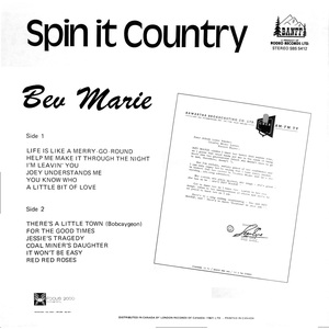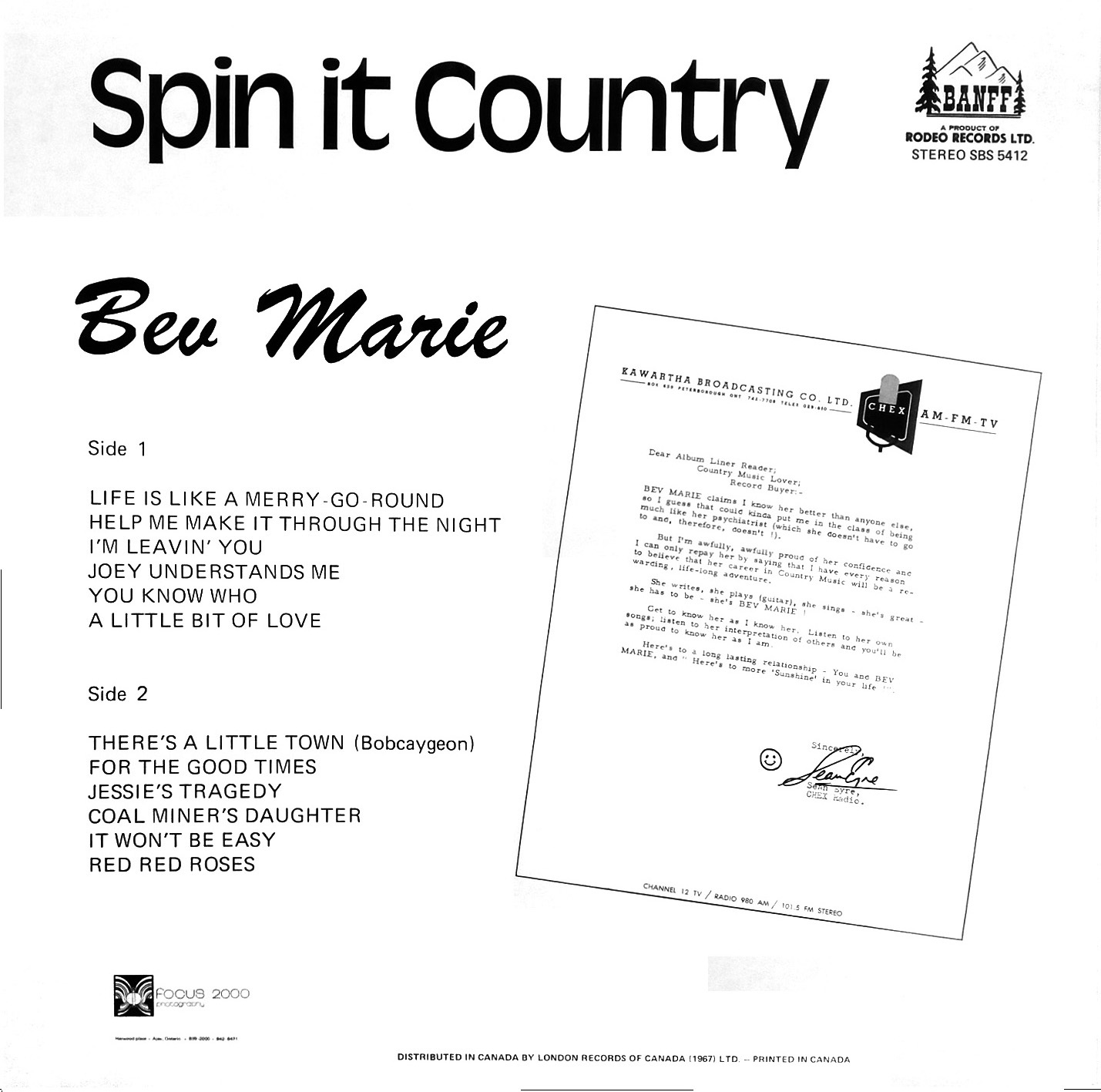 This, Bev's first L.P., contains three original songs, two of which were written solely by Bev and one with which she teamed up with a neighbour. "Moon Myth" and "No Not Me" are Bev's own compositions. "Is Loving Me A Habit (With You)" was a co-operative effort by Bev and Shirley Hele, Bev writing the music. The other songs on the album are standards by Tammy Wynette, Jeannie C. Riley, and other well-known artists.