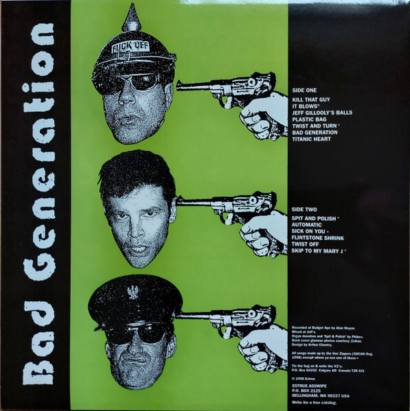 Their debut single Mighty Red Baron appeared in 1995 on Calgary’s Roto-flex label, wrapped in absurdist liner-note lore about the band’s supposed bloodline to Von Hindenburg. From there, the Von Zippers became fixtures in the international garage-punk revival. Estrus Records picked them up for the Würms double 7" in 1997 and the full-length Bad Generation in 1998. Those sessions became legendary for their anything-goes approach: as Alan Charlton later recalled, the shotgun blast on “Automatic” really did come from a double-barrel gun brought into the studio, while the siren on “Kill That Guy” was accidentally picked up by a tube compressor that happened to catch an ambulance driving by. Happy accidents like these only reinforced their reputation for chaos.