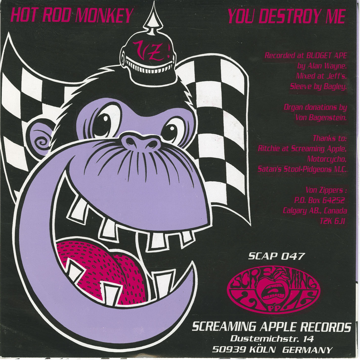 The Von Zippers crashed out of Calgary’s underground in the mid-1990s, a fuzz-drenched garage-punk gang billing themselves as the “Barons of the Beer Barrel Beat.” With Al Charlton on guitar and vocals, Doug Boland on bass, Rob Ferguson on drums, James Hayden on drums and vocals, and Chris Nevile on keyboards, vocals, and percussion, they built their reputation on sleazy Farfisa organ riffs, snarling guitars, and tongue-in-cheek mythmaking. Artist and fellow Calgary cult figure Tom Bagley also lent his visual flair, creating sleeve designs that cemented their cartoonish, biker-gang aesthetic.
