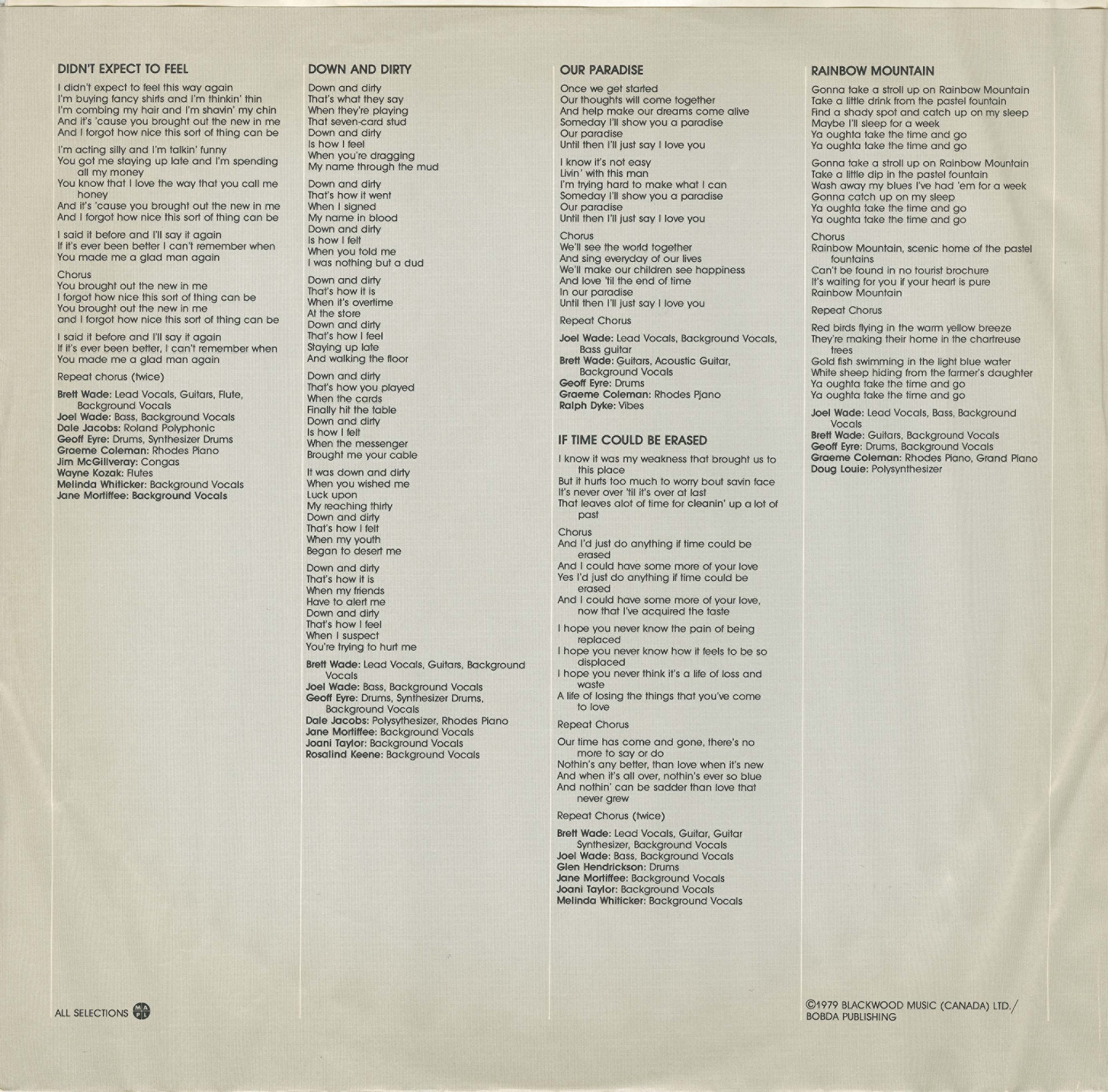 Brett Wade: lead vocals, guitar, guitar synthesizer, flute, background vocals