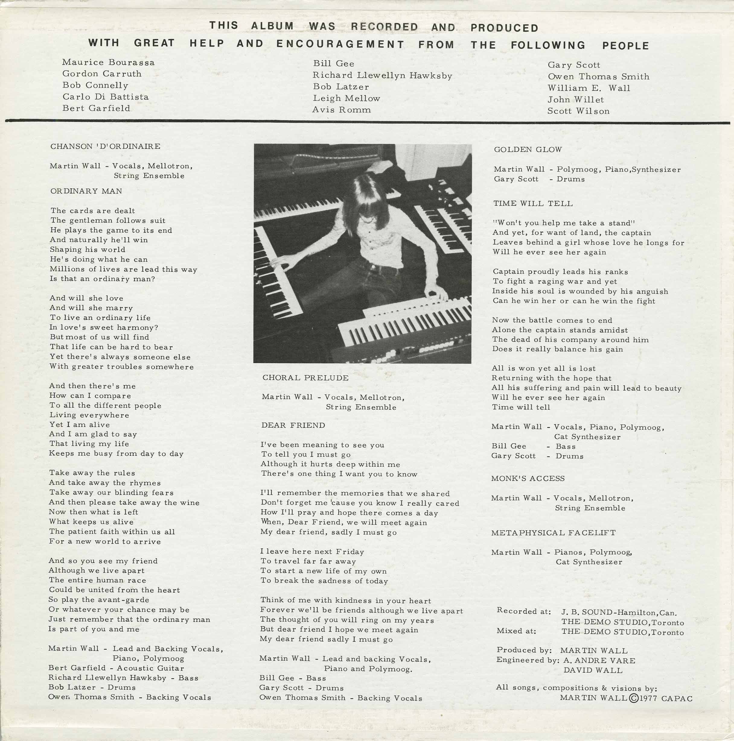 Martin Wall released this self-produced progressive moog synth style LP originally in 1977 on his own label MW-1. Martin Wall provided the lead and backing vocals, piano, polymoog, mellotron, and Cat synthesizers. He was joined by Bill Gee on bass; Gary Scott on drums; Bert Garfield on Acoustic guitar; Richard Llewellyn Hawksby on bass; Bob Latzer on drums; Owen Thomas Smith on backing vocals. The album was recorded at J.B. Sound in Hamilton, Ontario and The Demo Studio, Toronto, Ontario. Mixing was done at Demo Studio in Toronto. The Engineers were A. Andre Vare and David Wall. The all-original material features a 15 minute epic track on side 2 - "Metaphysical Facelift".