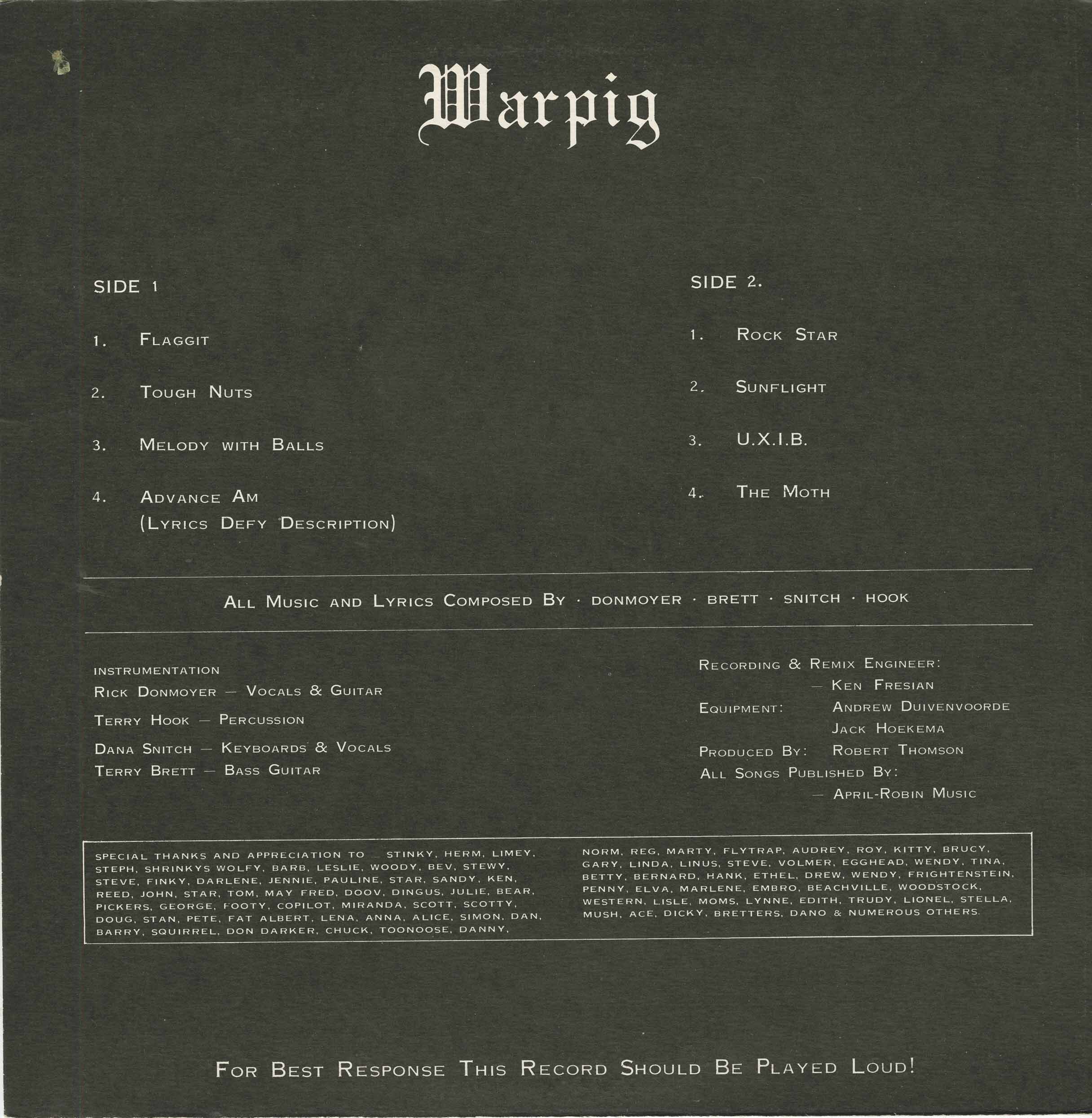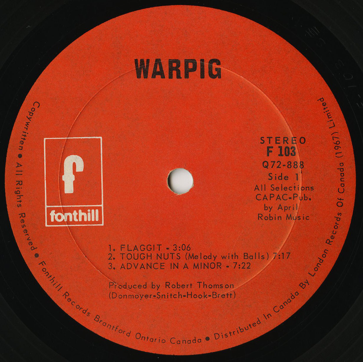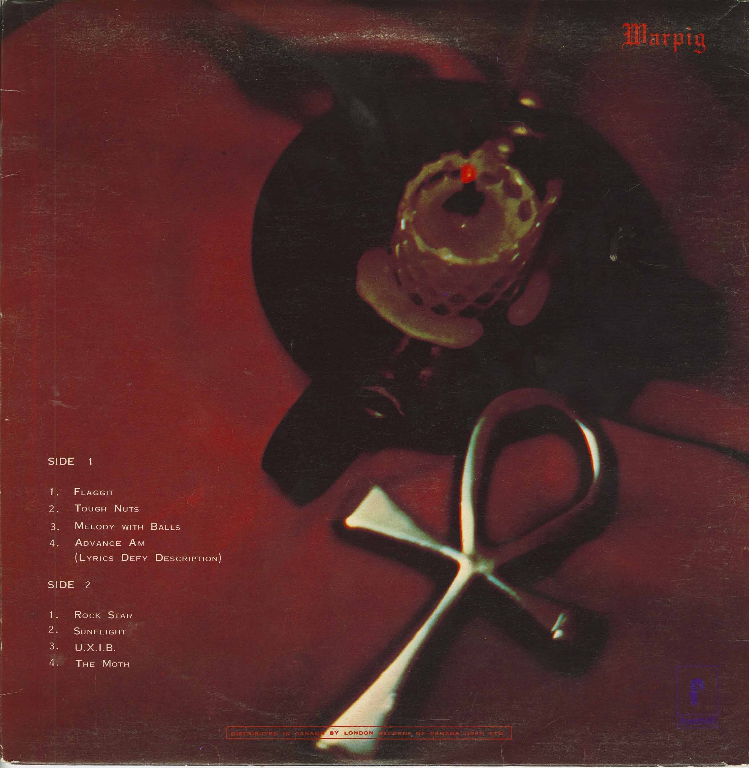 Warpig formed in Woodstock, Ontario in 1970. This album was recorded in Toronto and issued originally in 1971 on Fonthill F 103 with a gatefold. Warpig re-mastered their original album and it was re-issued in 1973 in both stereo and mono versions on London NAS 13528 with different versions of Rock Star and Flaggit and a different cover. Those two re-mastered tracks were also released as singles on London M 17452 and charted on RPM Top 100 in 1973.