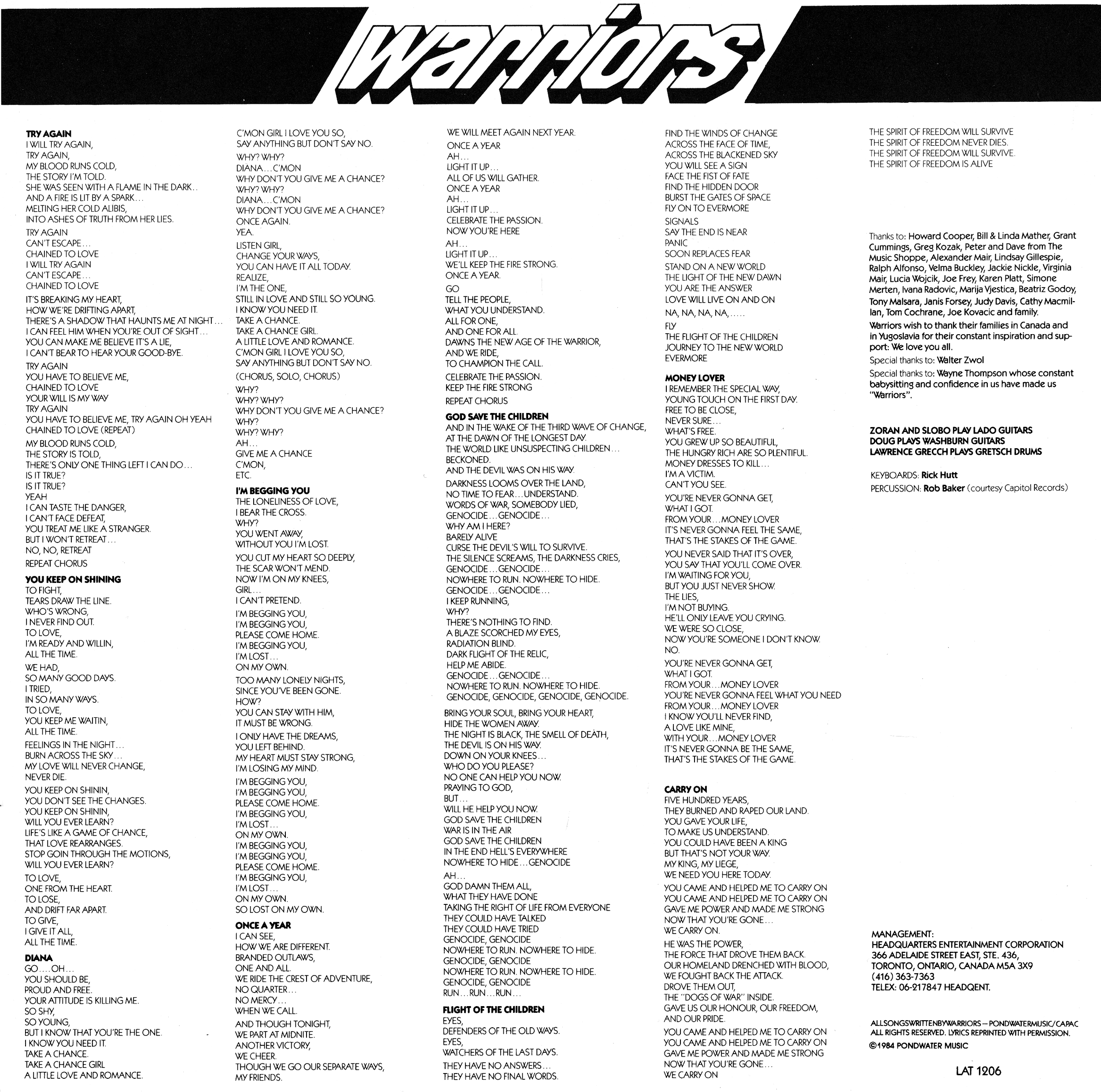 Engineered by Fraser Hill, assisted by Paul Shubat, Dan Baker, Vic pyle at Elora Sound, Elora, Ontario; and Noel Golden, Ed Stone, and Dave Dixon at Metalworks, Mississauga, Ontario