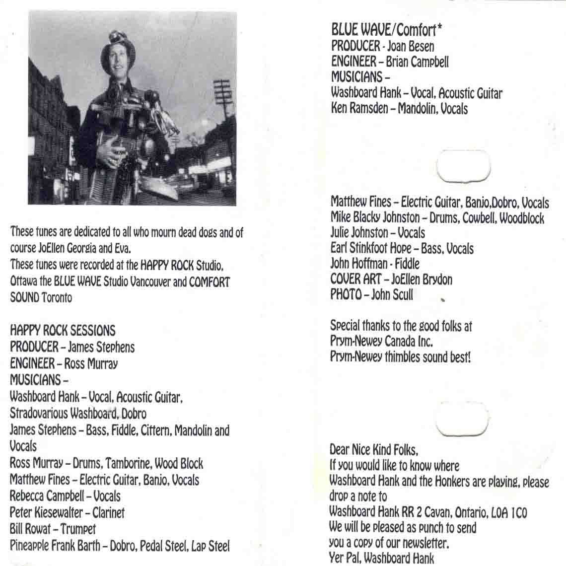 Washboard Hank has been an obscure legend of Hillbilly Junk Jazz for more than 30 years. Back in the 70s he toured the streets of North America with his pal Reverend Ken and together they created a whole new genre of music " punk bluegrass gospel" they would heal appliances and pass the collection plate while developing a style that was totally unforgetable. The show expanded to become Reverend Ken and the Lost Followers a full tilt five piece party band.