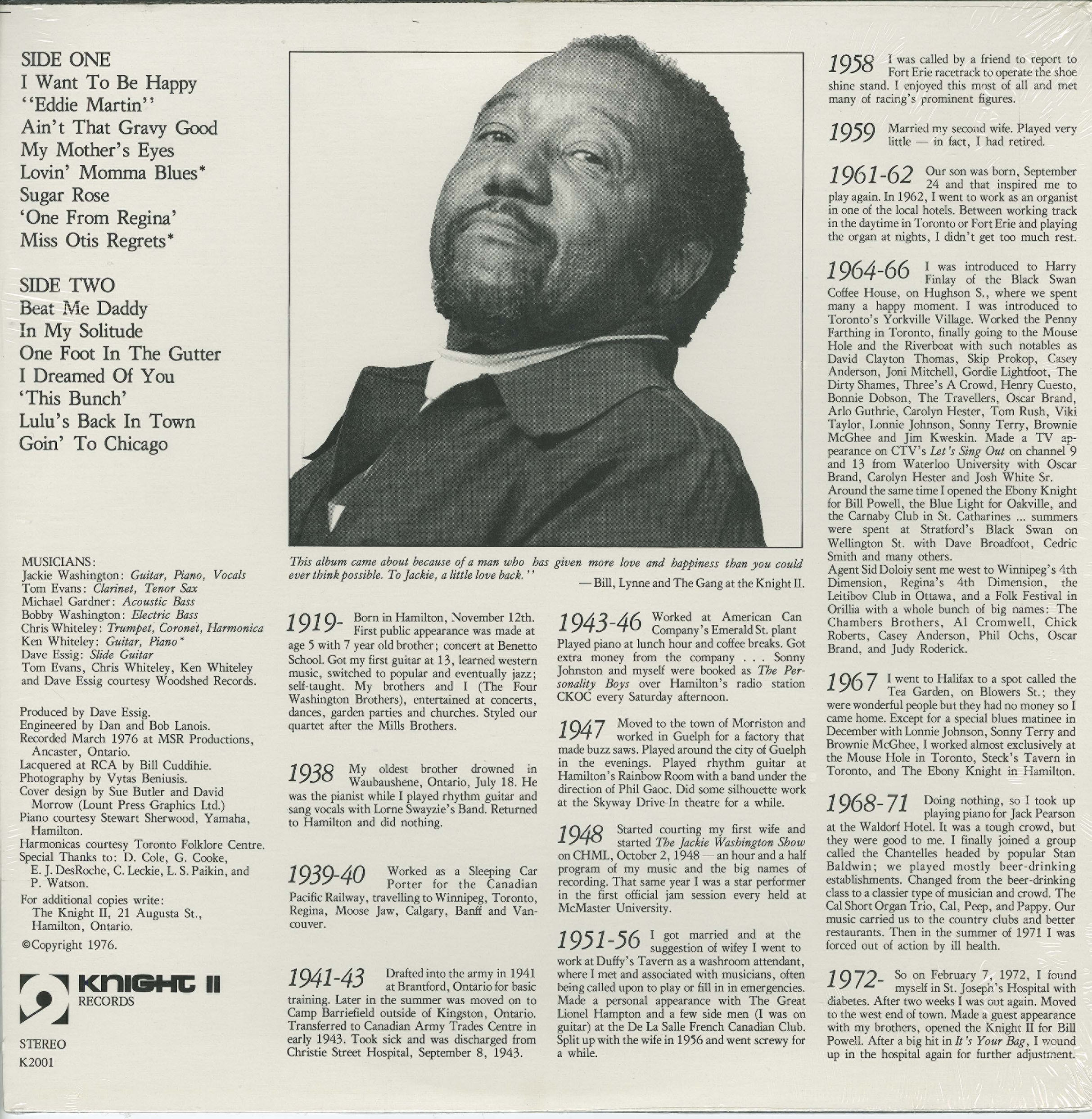 Jackie Washington grew up in Hamilton, Ontario's sizable Black community and started performing music at the age of five. He was a member of the Washington Brothers, whose sound was heavily influenced by the Mills Brothers, until the end of the 1930s. Washington left music as a profession during the '40s, but started singing in night clubs during the '50s. His debut album as a blues artist, Blues and Sentimental, was released in 1976. He played at folk and blues festivals throughout Canada, never venturing south of the border into the United States (where his grandparents had been slaves), and had a total of 1,200 songs at his fingertips. Washington's work transcended the folk and blues scenes, bringing him into contact with Duke Ellington, Clark Terry, and Lionel Hampton, among other jazz giants, as well as bluesmen Sonny Terry, Brownie McGhee, and Lonnie Johnson.