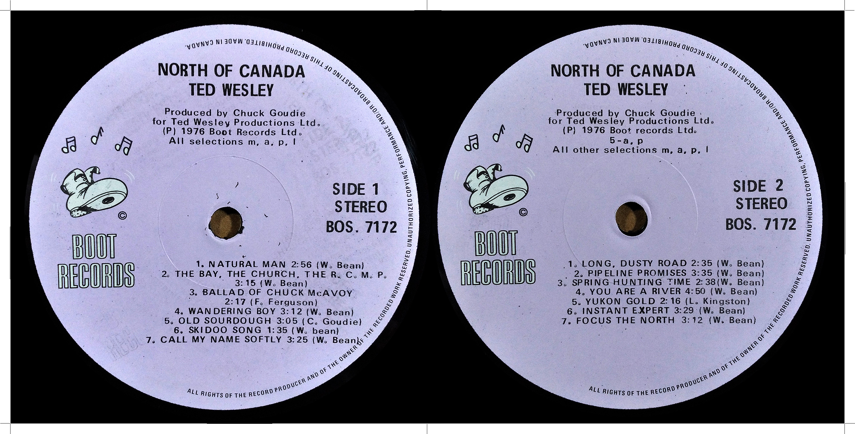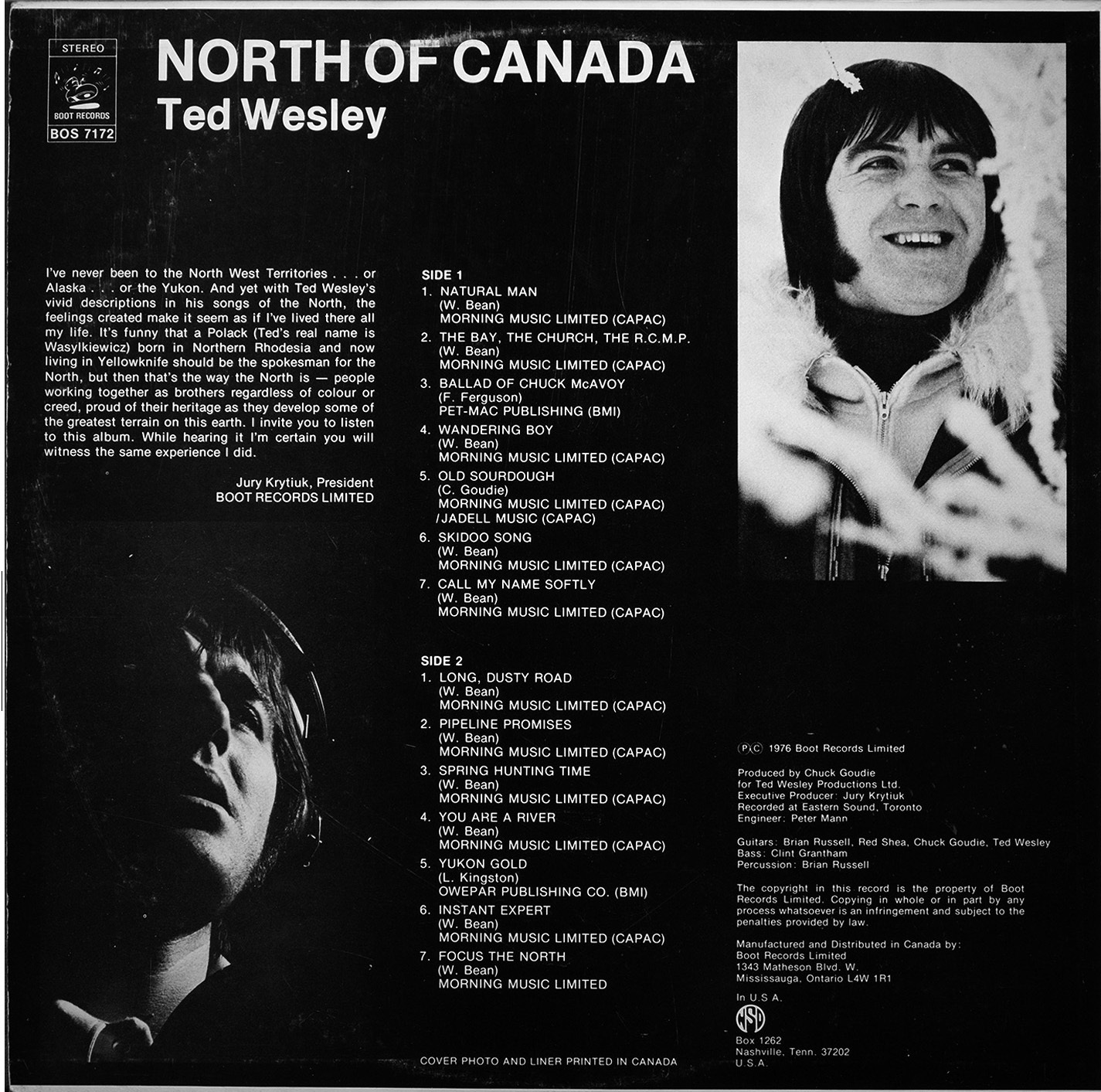I’ve never been to the North West Territories . . . or Alaska . . . or the Yukon. And yet with Ted Wesley’s vivid descriptions in his songs of the North, the feelings created make it seem as if I’ve lived there all my life. It’s funny that a Polack (Ted’s real name is Wasylczyszyn) born in Northern Rhodesia and now living in Yellowknife should be our spokesman for the North, but then that’s the way the North is — people working together as brothers regardless of colour or creed, proud of their heritage as they develop some of the greatest terrain on this earth. I invite you to listen to this album. While hearing it I’m certain you will witness the same experience I did.
