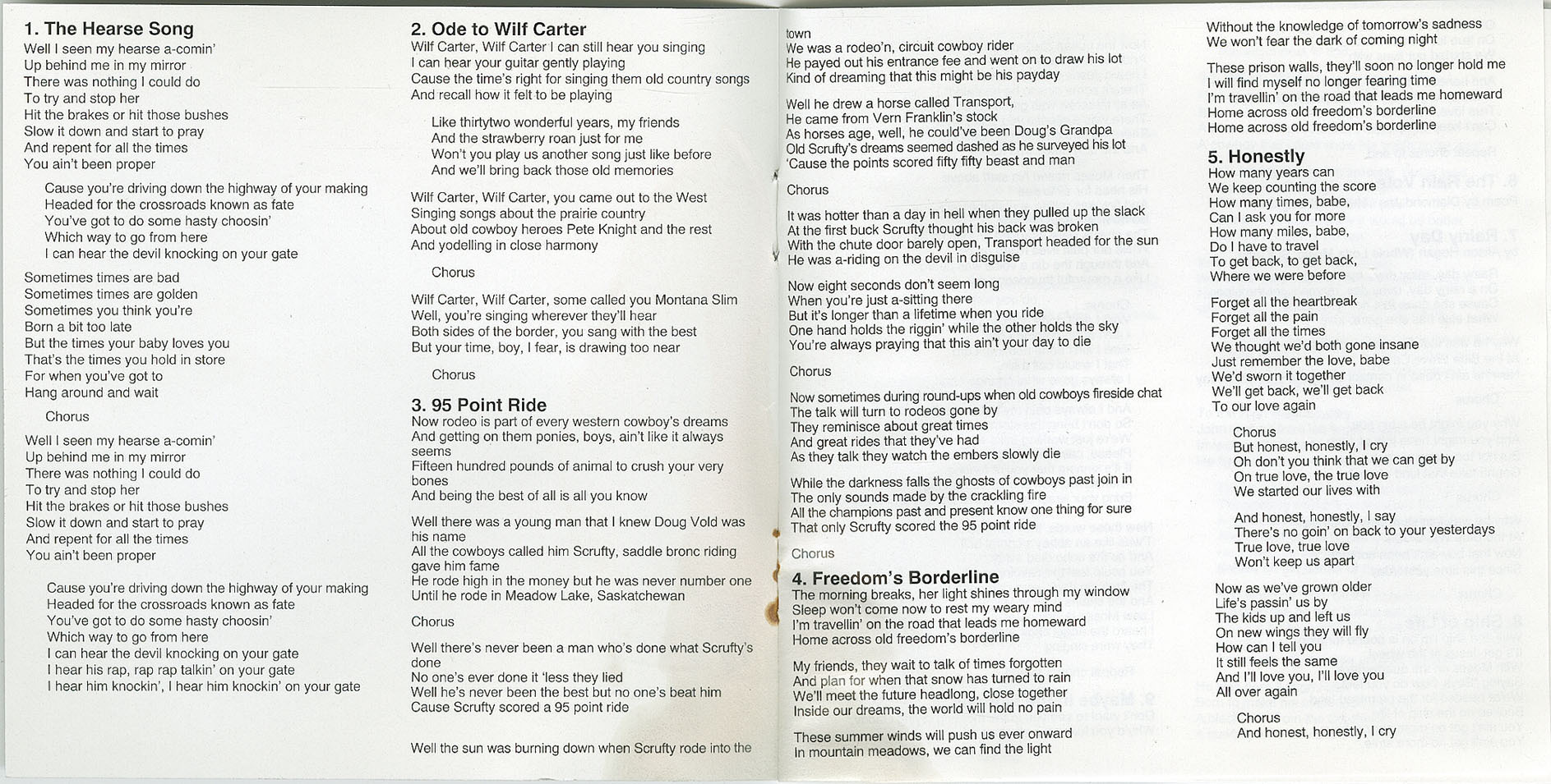 We are presenting this collection of tunes: some old, some new, on the c.d. format because the old albums are probably all scratched up. The project was recorded at Melodeon Studios here in Chemainus February 14–17, 1997. We set up in the round and recorded live with very little overdubbing, hence, the title Honestly. This is the way my music was written and the way I’ve always wanted it produced.