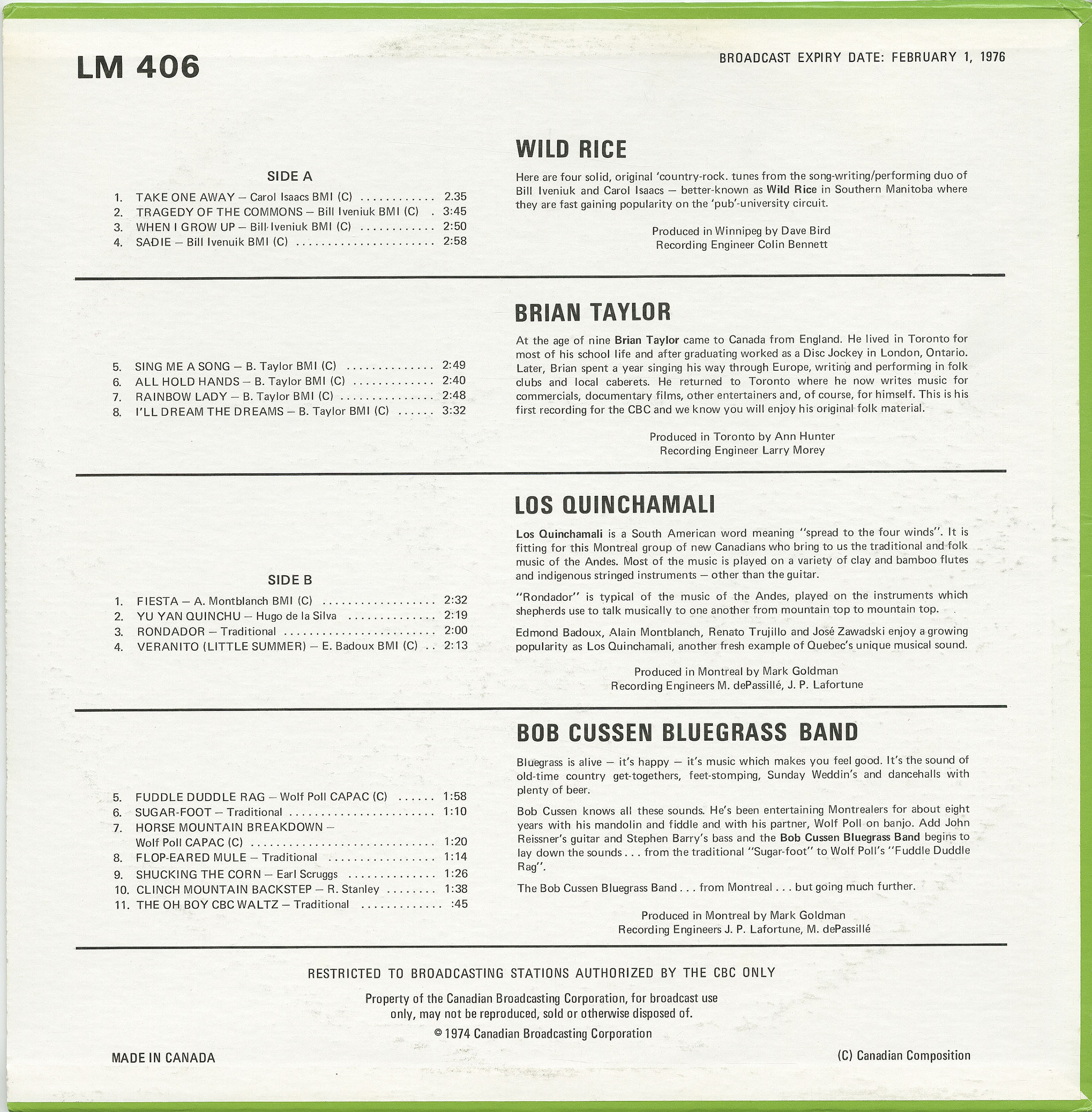 Produced by Dave Bird, Winnipeg, Manitoba