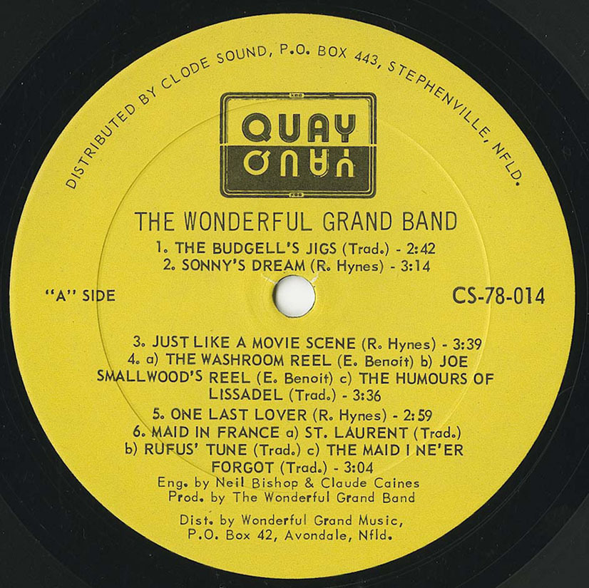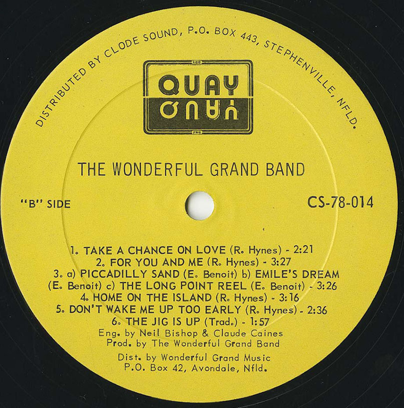 Mostly traditional Newfoundland music featuring Newfoundland's finest songwriter Ron Hynes, Glenn Simmons who later formed THE FABLES, Kelly Russell (once a member of Figgy Duff and The Plankerdown Band), Sandy Morris on guitar, Bryan Hennessey, and Rocky Wiseman on drums. The Wonderful Grand Band became one of Newfoundland's most popular acts, combining traditional and original songs with fresh musical ideas. The band spent six years touring, producing its own television series and recorded two albums. (2 albums never released outside Newf., led by Ron Hynes, often worked with satirists who later became the Codco troupe).