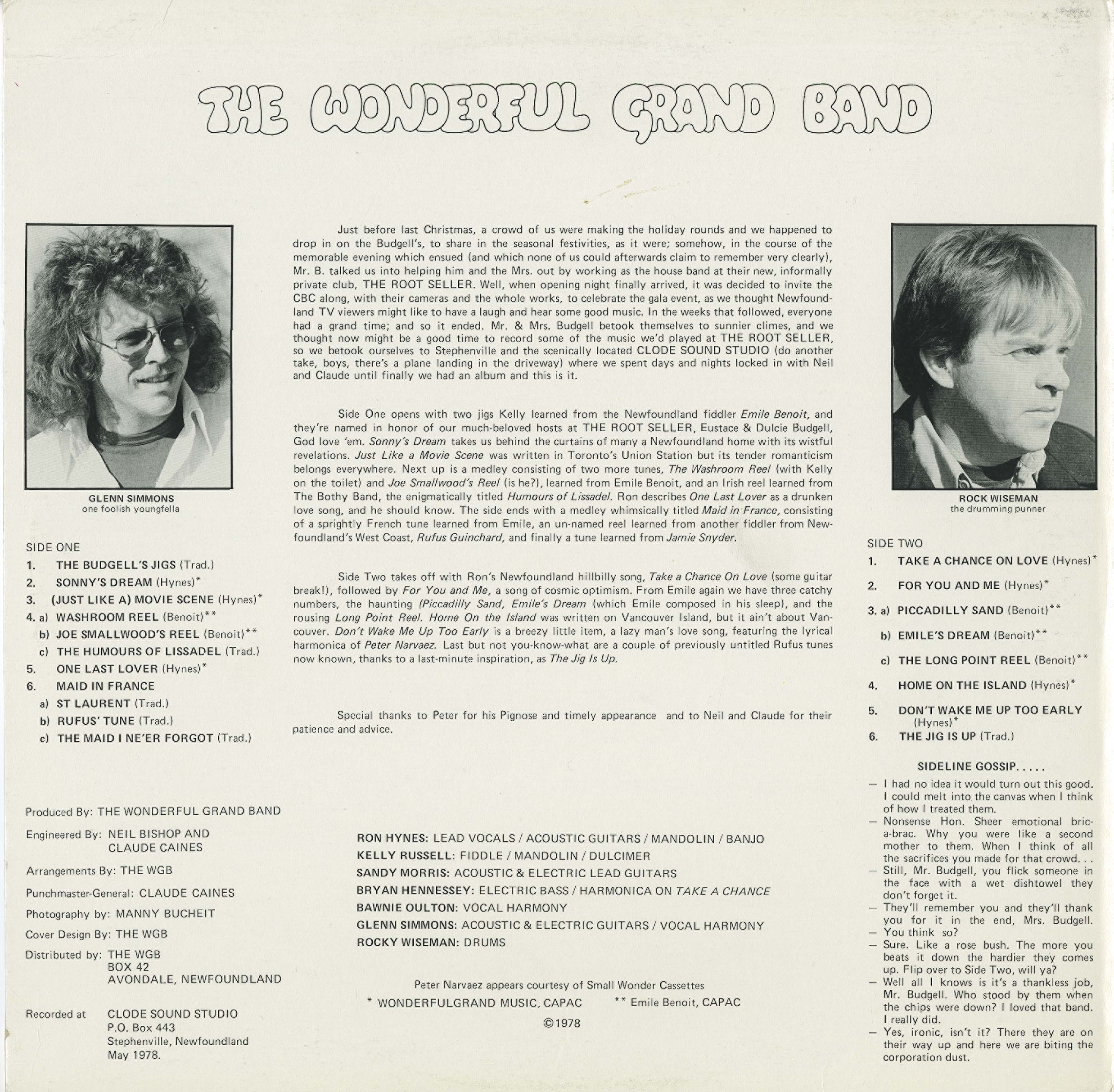 The WGB is pleased to present it's first classic album of 1978 - Wonderful Grand Band. Recorded at Clode Sound Studio in Stephenville, fresh from the Root Seller TV Series, this is the sound and musicianship we came to know and love in the 80's in the sensationally successful TV show WGB.