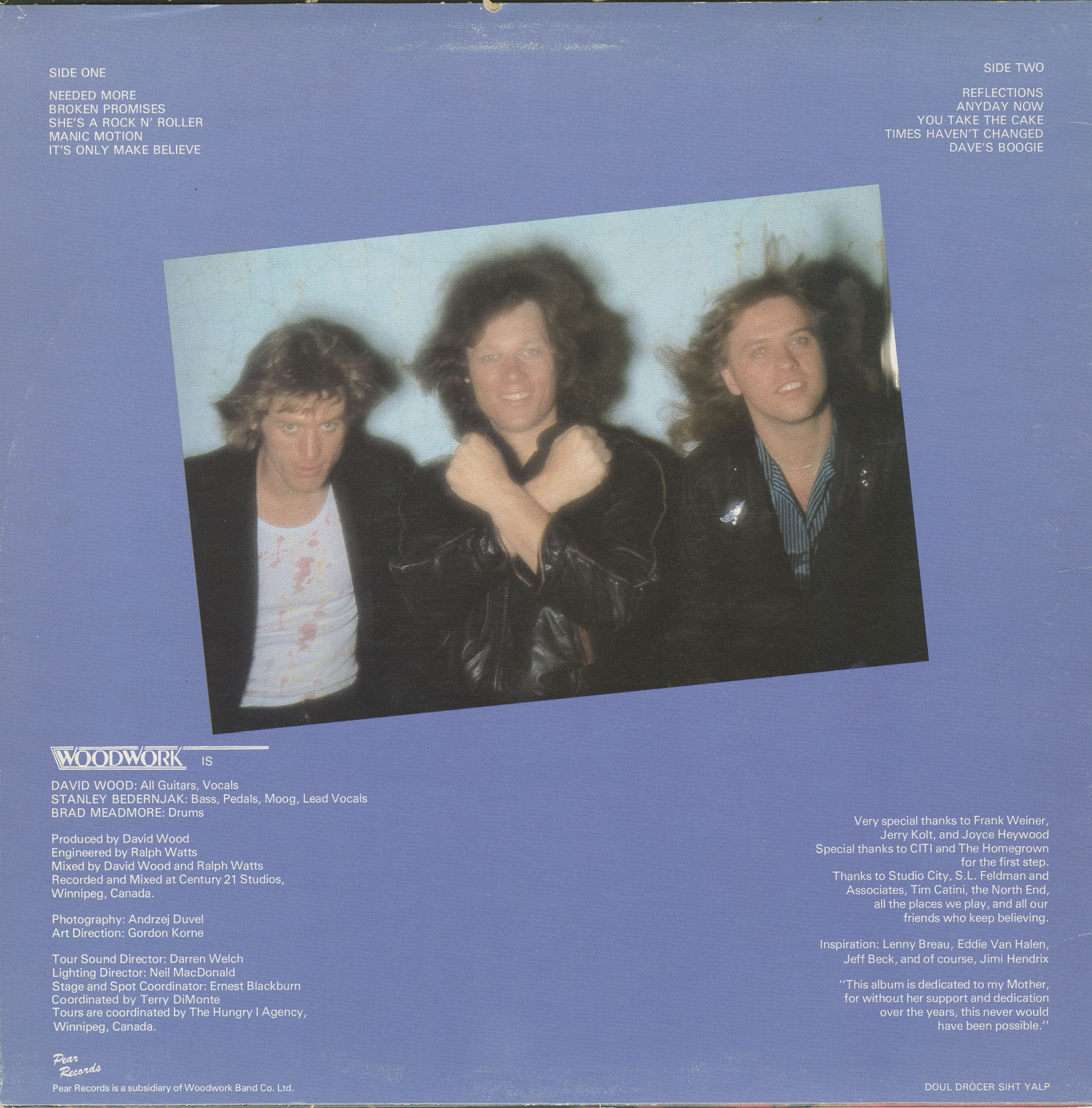 By 1981, having built a strong regional following, Woodwork entered Winnipeg's Century 21 Studios and recorded their lone LP, Anyday Now, over the course of three days. Produced by Wood and engineered by Ralph Watts, the album features all original material primarily written by Wood and Bedernjak, capturing the band's fierce, sweaty live energy and songwriting maturity.