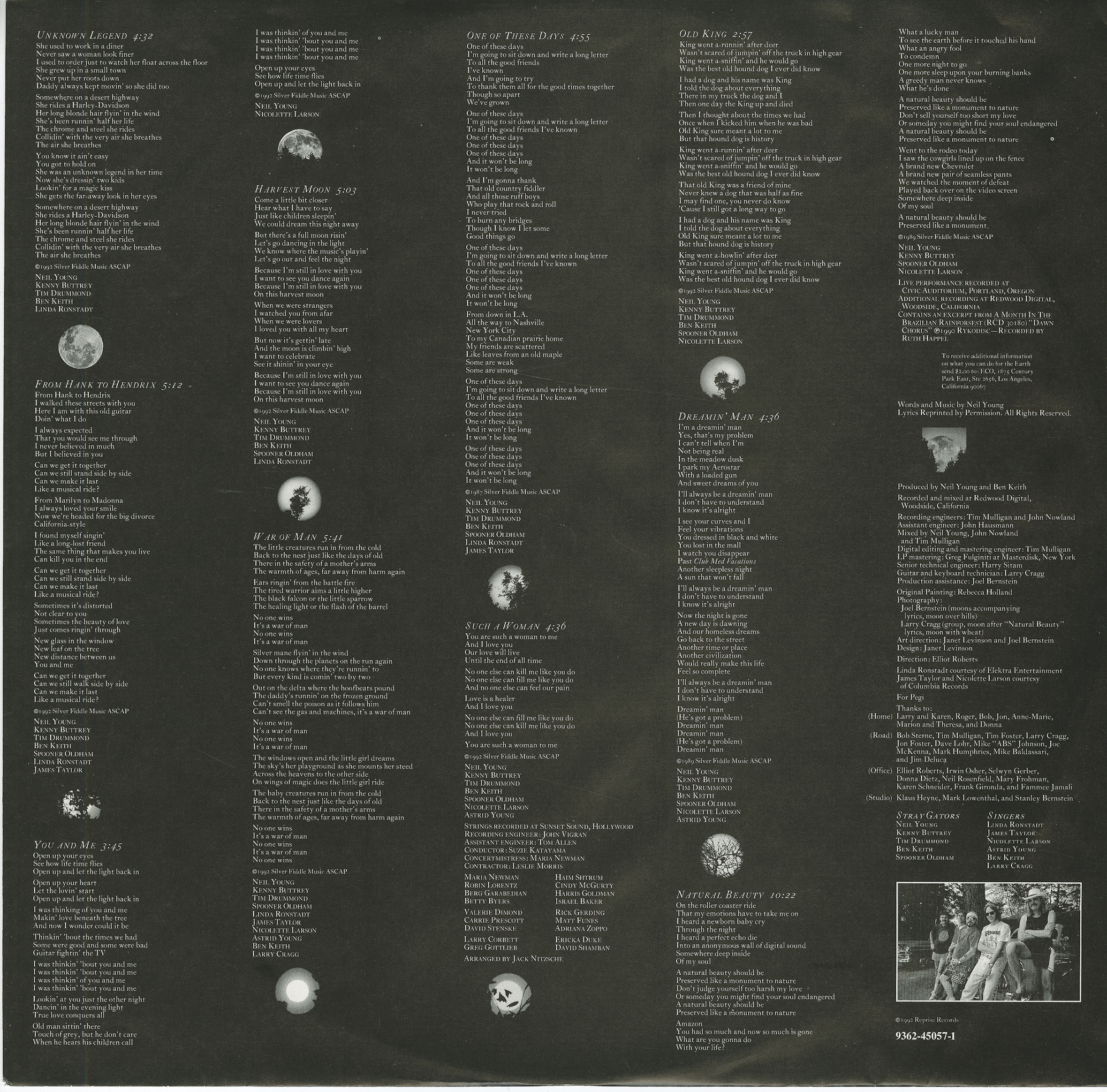 The track “You and Me,” a quiet paean to domesticity that quotes from the Harvest hit “Old Man,” is the musical link between the albums, according to Young: “That song was started in 1975, but I never finished it. In 1976, [bassist] Tim Drummond heard it and said: ‘You’ve got to finish that, man. That’s like Harvest stuff, let’s do that.’ And that kinda freaked me out, I got spooked by it, because it was like someone said what it was before we did it. I don’t want to feel like I’m just filling in the numbers.” But along with this new batch of compositions came a new intro and last verse, and the twenty-year-long jump was completed.