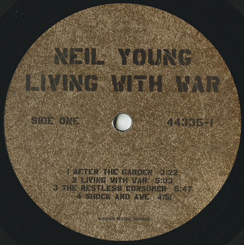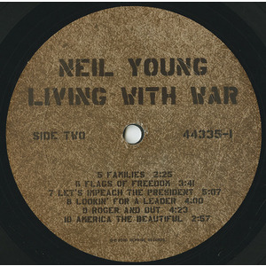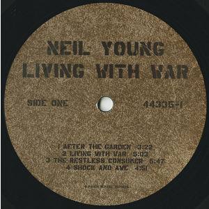 But from a musical perspective, Living With War's short gestation benefits Young's performance, inspiring him to make his loudest, rawest release of new material since at least Ragged Glory, maybe even Rust Never Sleeps. With his guitar re-tuned to its characteristic distorted snarl, and the clearly live mix preserving bum notes and sloppy harmonica or trumpet solos, Young returns to the spontaneous recording style of albums like Tonight's the Night that best suits his talents. Coming hot on the heels of the contemplative Prairie Wind, the serrated guitar of "After the Garden" and "Restless Consumer" quickly puts to rest any notion that post-aneurysm, sixty-something Neil was going to slip quietly into retirement.