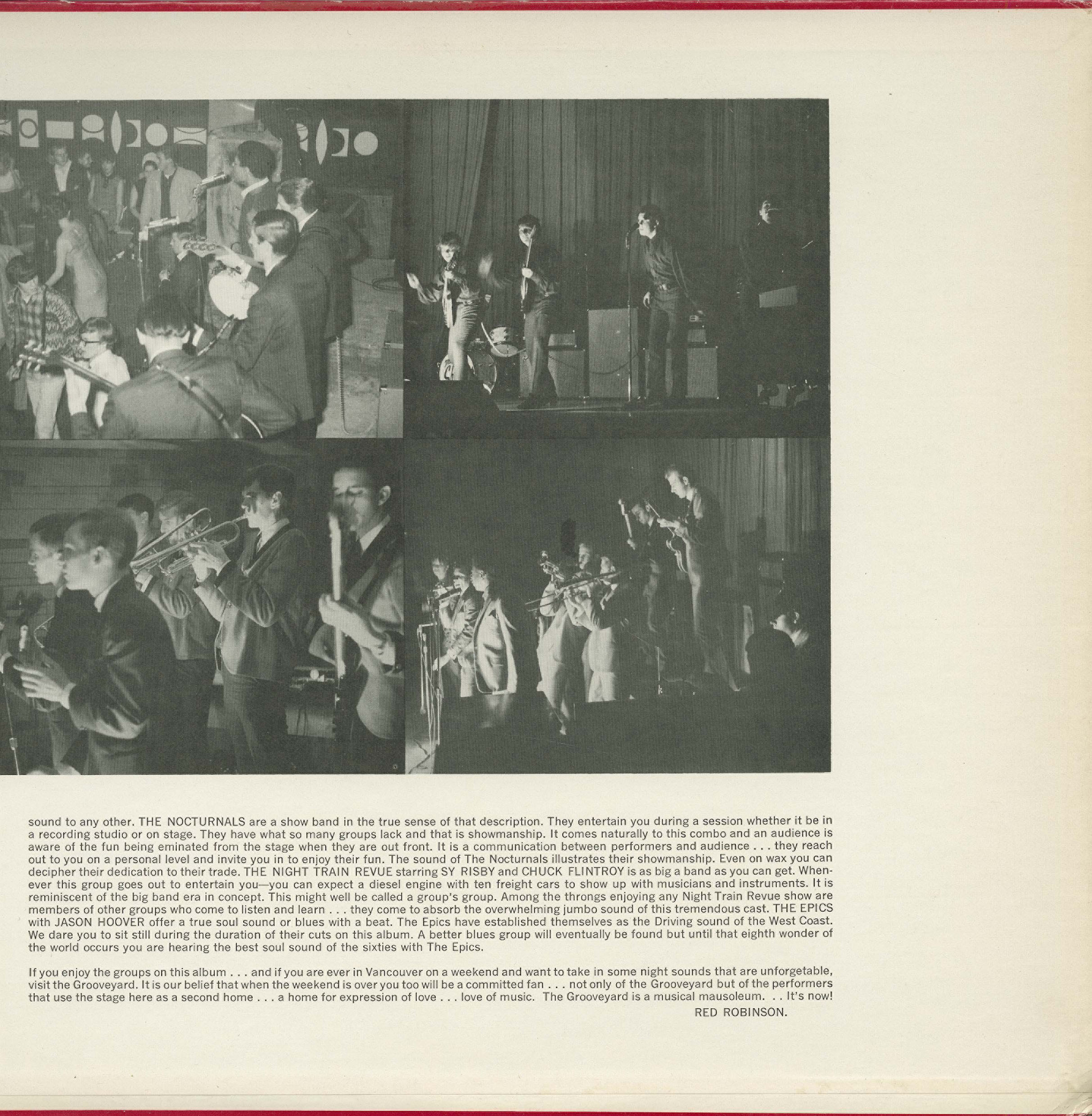 It's hard to believe that New Westminster could be the heart of the R&B Scene, but there it was, the mid 60's, and IKE AND TINA TURNER were on the bill! The former Hollywood Bowl, under new ownership of Les Vogt and the management of Douglas Miller, became the short lived Grooveyard, and took its rightful place in local music history. MARVIN GAYE, ETTA JAMES, LITTLE JUNIOR PARKER, THE SPINNERS, and BO DIDDLEY performed there, as well as hot Northwest groups THE KINGSMEN, PAUL REVERE AND THE RAIDERS, DON AND THE GOODTIMES, and even THE SONICS. Most importantly, The Grooveyard gave some of Vancouver's hottest acts a stage and, on some very special evenings, you could see up to ten live bands and dance 'til you dropped. It just didn't get any better. The original album was the brainchild of Les Vogt, band manager, concert promoter, rockabilly performer, and owner of the Grooveyard. He thought the album would generate more publicity for the club and the bands in his management stable. He took his idea to musician and song writer Tom Northcott and local entrepreneur Jack Herschorn at their offices, where they operated New Syndrome Records.
