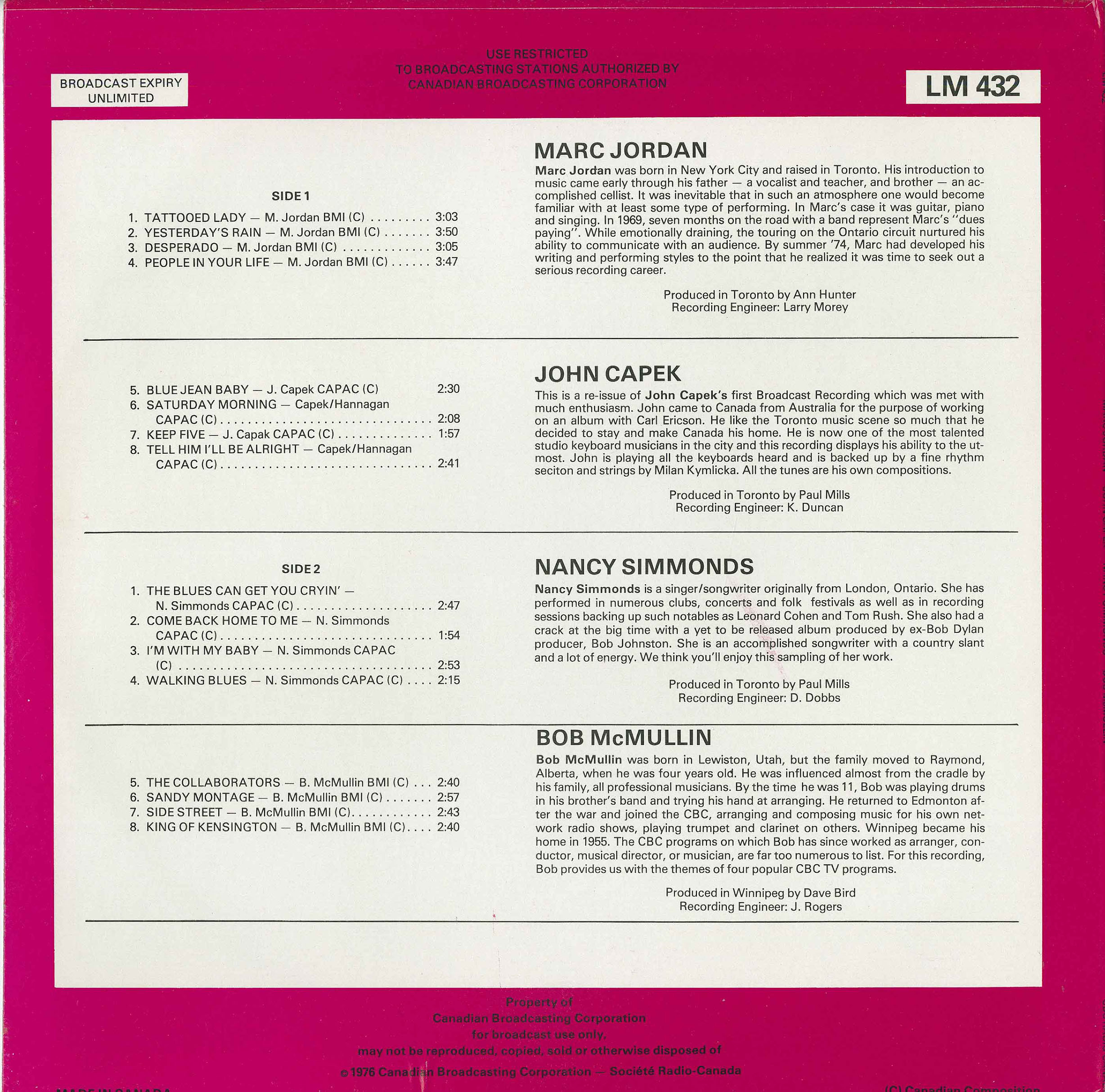 This is a re-issue of John Capek’s first Broadcast Recording which was met with excellent distribution. John came to Canada from Australia for the purpose of working on an album with Ceri Eirson. He liked the Toronto music scene so much that he decided to remain and make Canada his home. This is one of the most talented keyboard artists and musicians in the mid 70’s. He is heavily associated with current pop/rock today, playing the keyboards heard and strings by Milan Kymlicka. All the tunes are his own compositions.