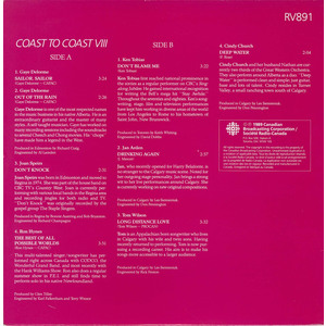 Coast to Coast VIII included many early and first original recordings by Canadian artists including first recordings by Gaye Delorme, Jann Arden, and Cindy Church as well as tracks by Ron Hynes, Ken Tobias Tom Wilson, and Joan Speirs that are unique to this album.