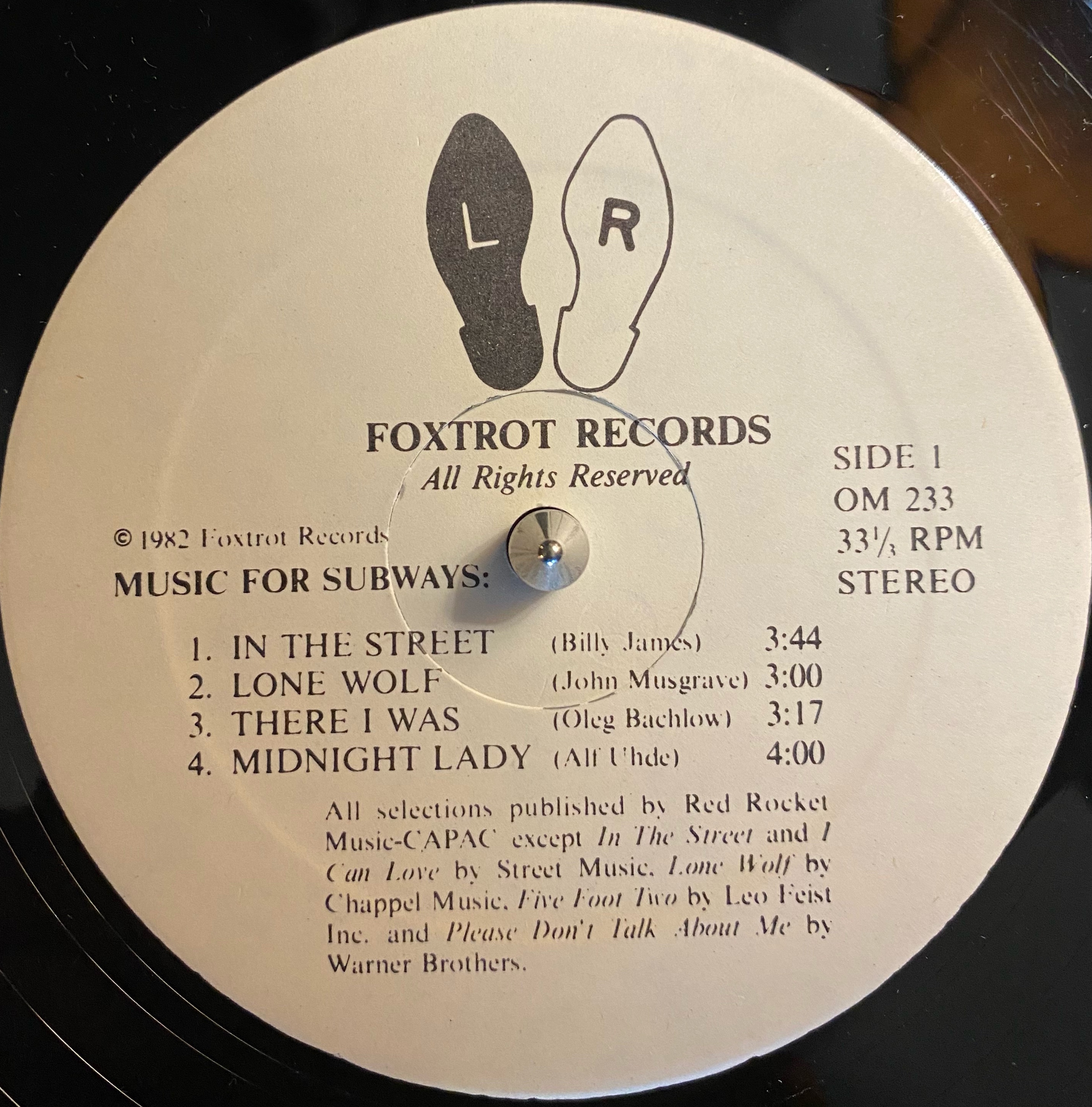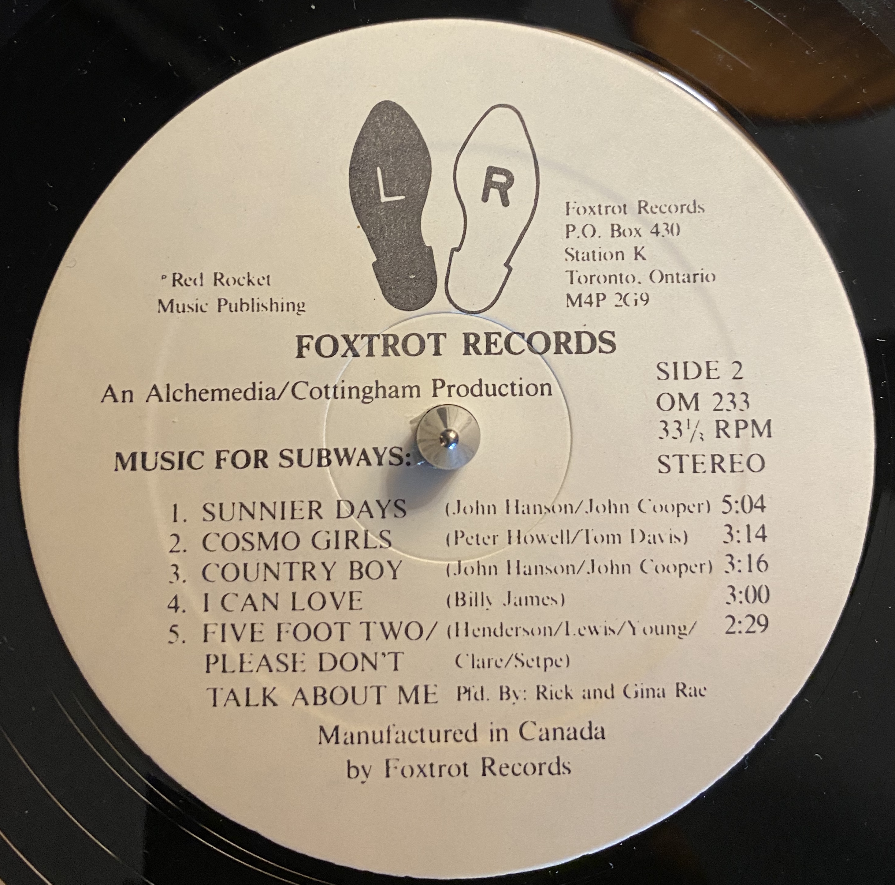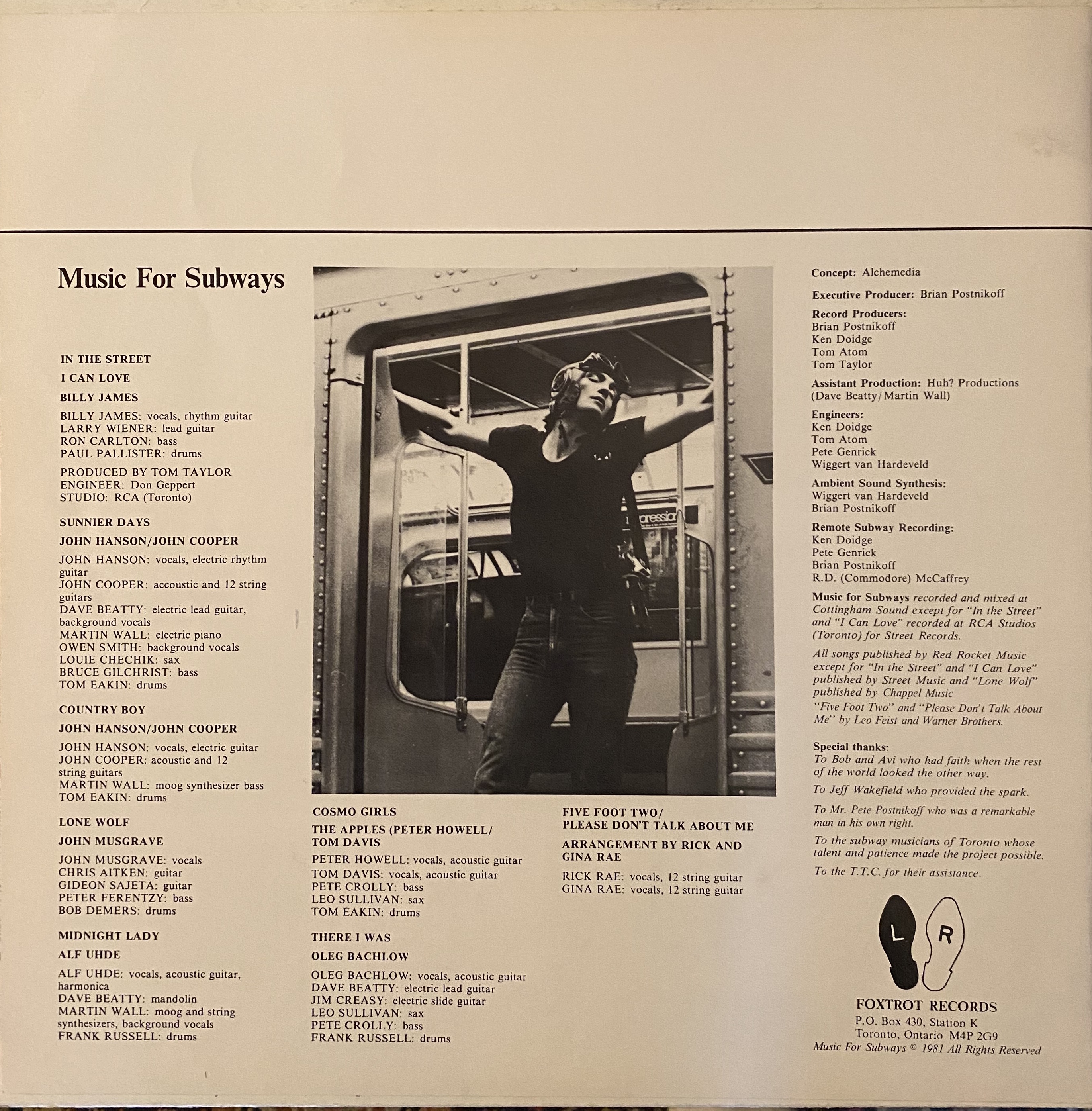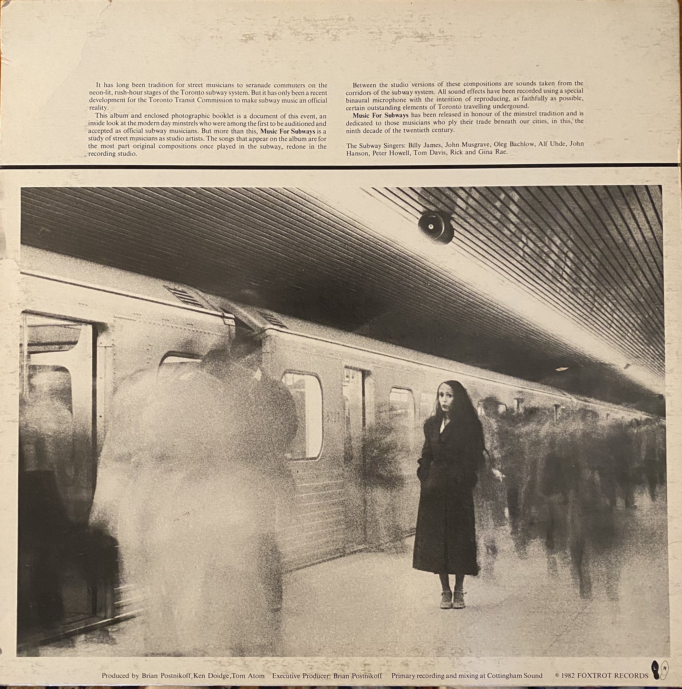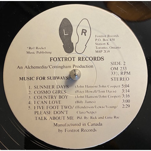 Two years later, the album Music For Subways was recorded. It featured songs by the original eight buskers and came complete with a striking album cover photo and a large booklet with profiles of the artists and an essay on the history of street musicians. Gina Rae was the daughter of one of The Byron Brothers, recording artists for RCA Victor in the '30's, and granddaughter to a vaudeville song and dance team who performed in Canada and the United States during the early 1900's. By the age of 11 she was writing her own songs and performing in talent shows, and in 1979 she left her day job as a welfare field worker and started singing in clubs in and around Toronto. One night, Rick came in and did a guest duet with Gina, and before long he'd left his job managing an IGA store in Sutton and married her. According to the liner notes they moved on from playing in the subway to nightclubs in Toronto, but I have no idea if or how long they continued on as working musicians.
