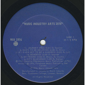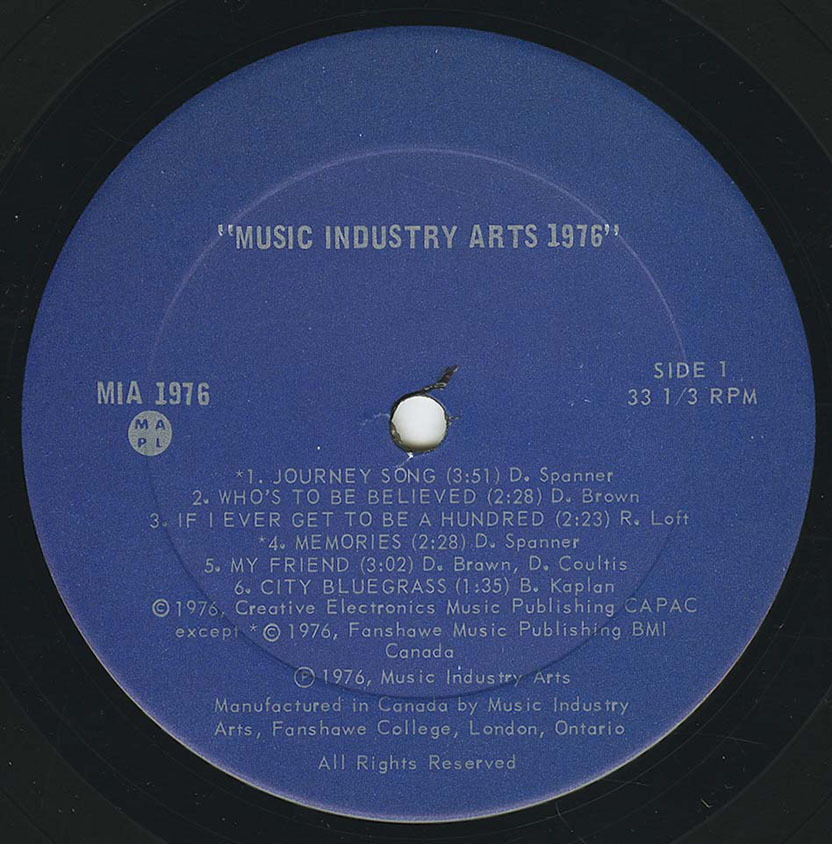 Recorded and mixed at Music Industry Arts Sound Studios, Fanshawe College, London, Ontario, September, 1975 to April, 1976.