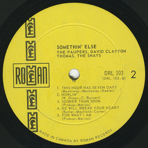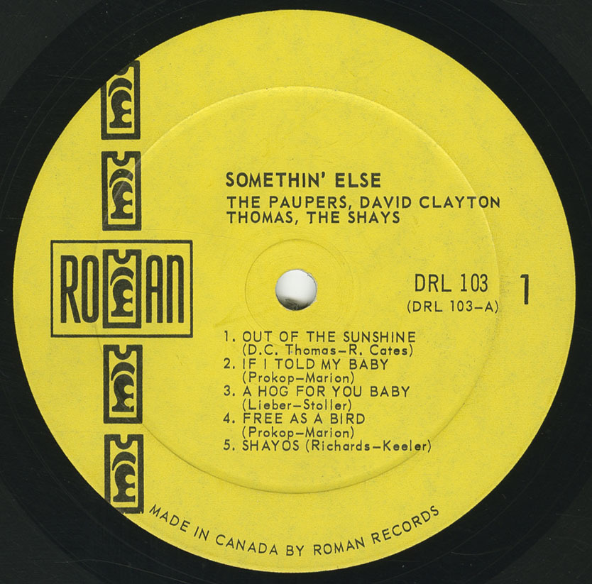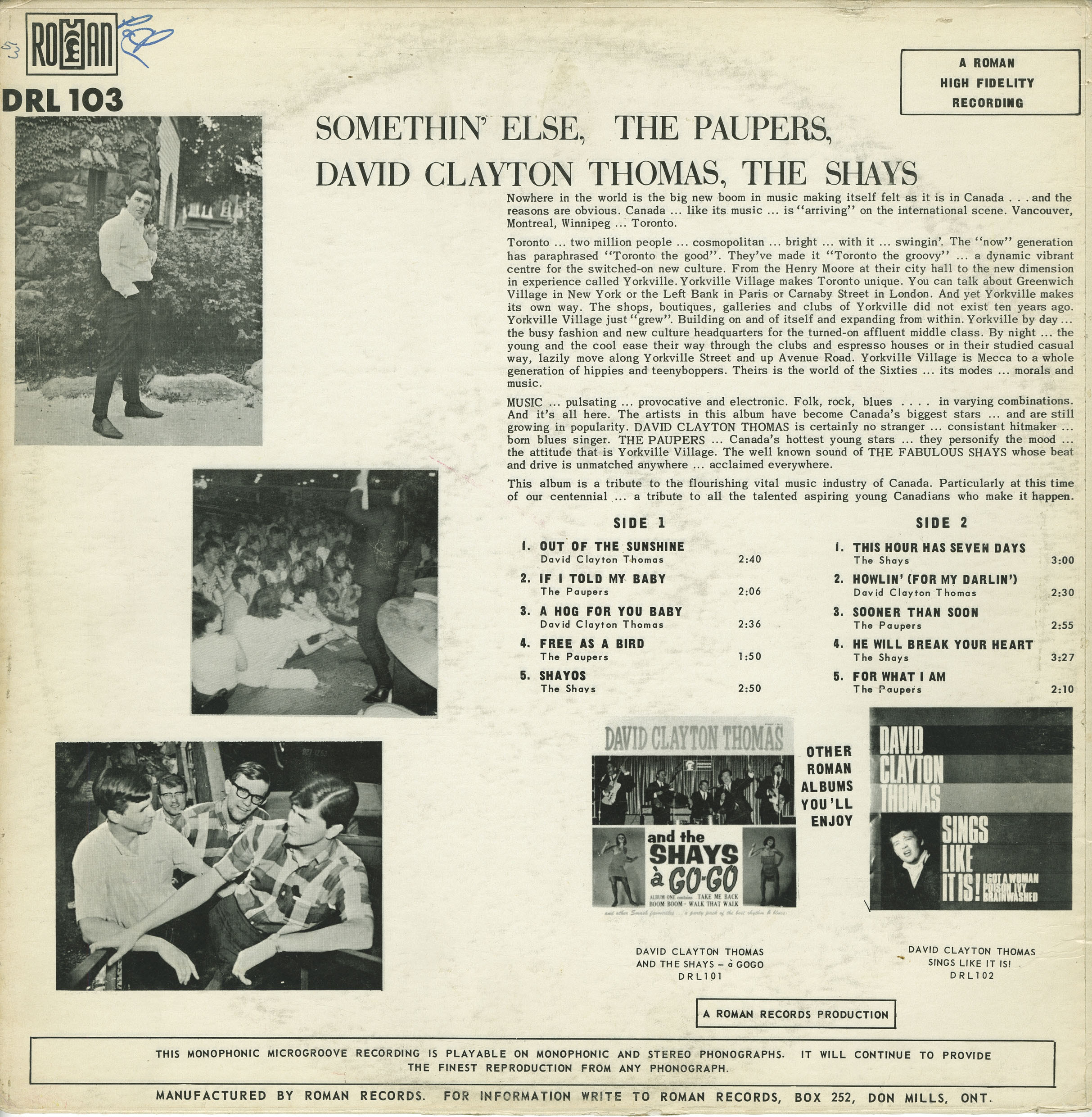 MUSIC ... pulsating ... provocative and electronic. Folk, rock, blues .... in varying combinations. And it’s all here. The artists in this album have become Canada’s biggest stars ... and are still growing in popularity. DAVID CLAYTON THOMAS is certainly no stranger ... consistent hitmaker ... born blues singer. THE PAUPERS ... Canada’s hottest young stars ... they personify the mood ... the attitude that is Yorkville Village. The well known sound of THE FABULOUS SHAYS whose beat and drive is unmatched anywhere ... acclaimed everywhere.