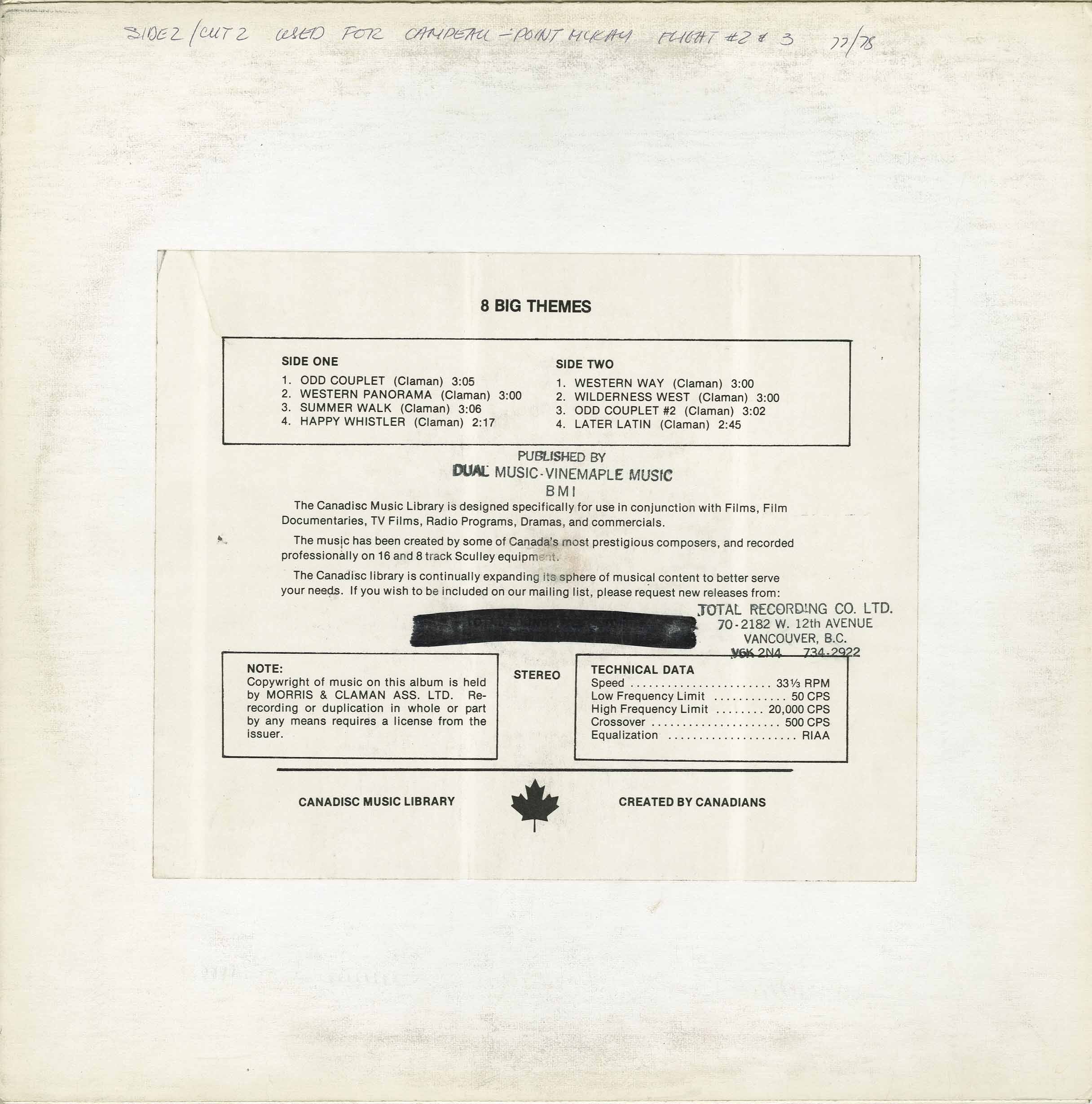Dolores Claman was one of Canada's greatest composers, but she only had a handful of these Canadisc Library albums ever cut. After attending The Juilliard School of Music, one of her first and worst jobs was playing piano in at a school in Queens to a bunch of "reluctant tots and ambitious mothers". She went on to write Canada's most recognizable song, "The Hockey Night in Canada Theme" in 1968 (orchestration by Jerry Toth). She also founded Quartet Productions with Howard Cable. She wrote the musical scores for "Klondike", "Mr. Scrooge", as well as thousands of jingles, including the theme songs for the Young Canada Games, Ontario Place and "A Place To Stand (Ontari-ari-ario)" for the Ontario Government in 1967; a few of her other jingles are featured on this rare Canadisc Library LP.