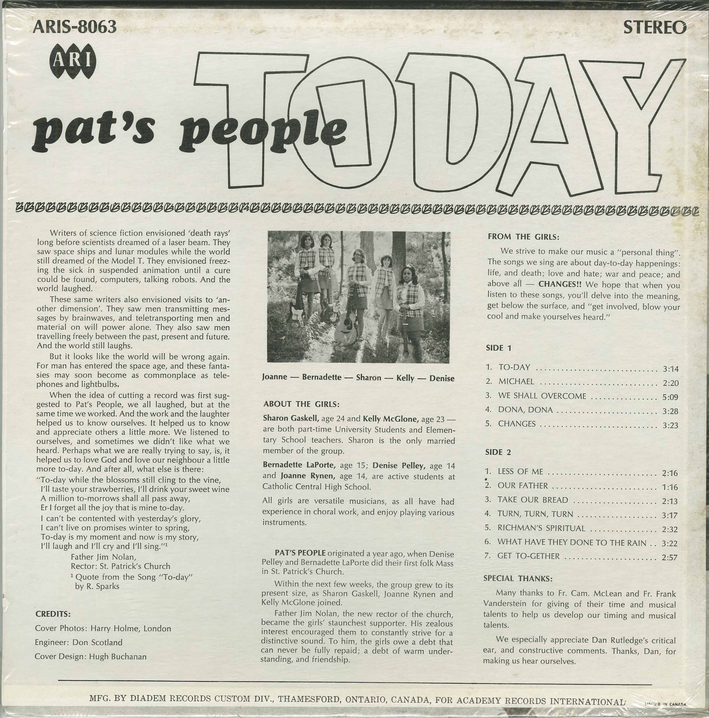The group originated after teenagers Denise Pelley and Bernadette LaPorte performed their first folk Mass at the church. Encouraged by new rector Father Jim Nolan, the ensemble soon expanded to include Joanne Rynen, Sharon Gaskell, and Kelly McGlone. Over the course of the following year, they rehearsed regularly, curated a mix of folk-rock standards and spiritual songs, and arranged their music with the goal of “making it a personal thing.” The resulting album, Today, was released through Academy Records International and manufactured by Diadem Records in Thamesford, Ontario.