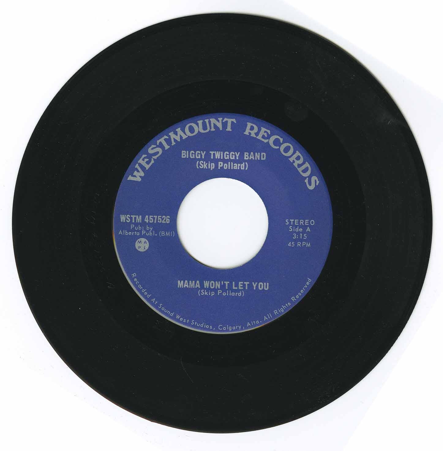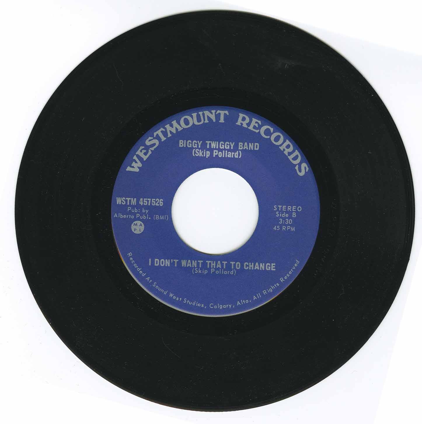 Singer and bandleader Skip Pollard moved to Calgary in 1971 and formed the Biggy Twiggy Band to tour between Thunder Bay and Vancouver. This undiscovered gem, the band’s lone seven-inch, was recorded at an old re-furbished church in Calgary for Peter Bentley’s Calgary-based Westmount label, known more for country music than for stellar funk/soul dancefloor monsters like this. ‘Mama Won't Let You’ has a nice seventies funk sound with great falsetto vocals. A real dancer! The flip, ‘I Don't Want That to Change’, is a smooth upbeat seventies soul ballad with an amazing horn section and vocals.