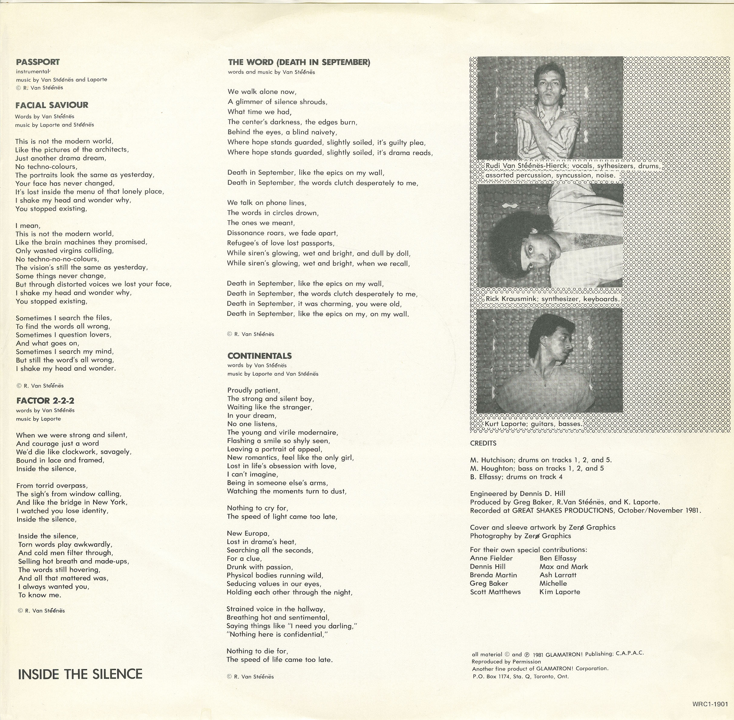 Formed around 1980 by punk rocker Rude van Steenes (ARSON) and Kurt LaPorte, GLAMATRON! is one of the best kept crate-digger secrets in the Canadian vaults. Their sole LP, Only the Heart Beats ... Inside the Silence was self-released in 1981, and proudly showed its influences, Bowie, Roxy Music, Lou Reed, Marc Bolan & T-Rex, as well as early Ultravox, Wire and Magazine, on its sleeve. The band played several shows and made radio and television appearances, recorded a second album (which was shelved) and ultimately broke up in 1984. van Steenes and LaPorte then formed Vis-A-Vis, which was nominated for two awards and won the 1987 CASBY Award for Best Independent Artist.