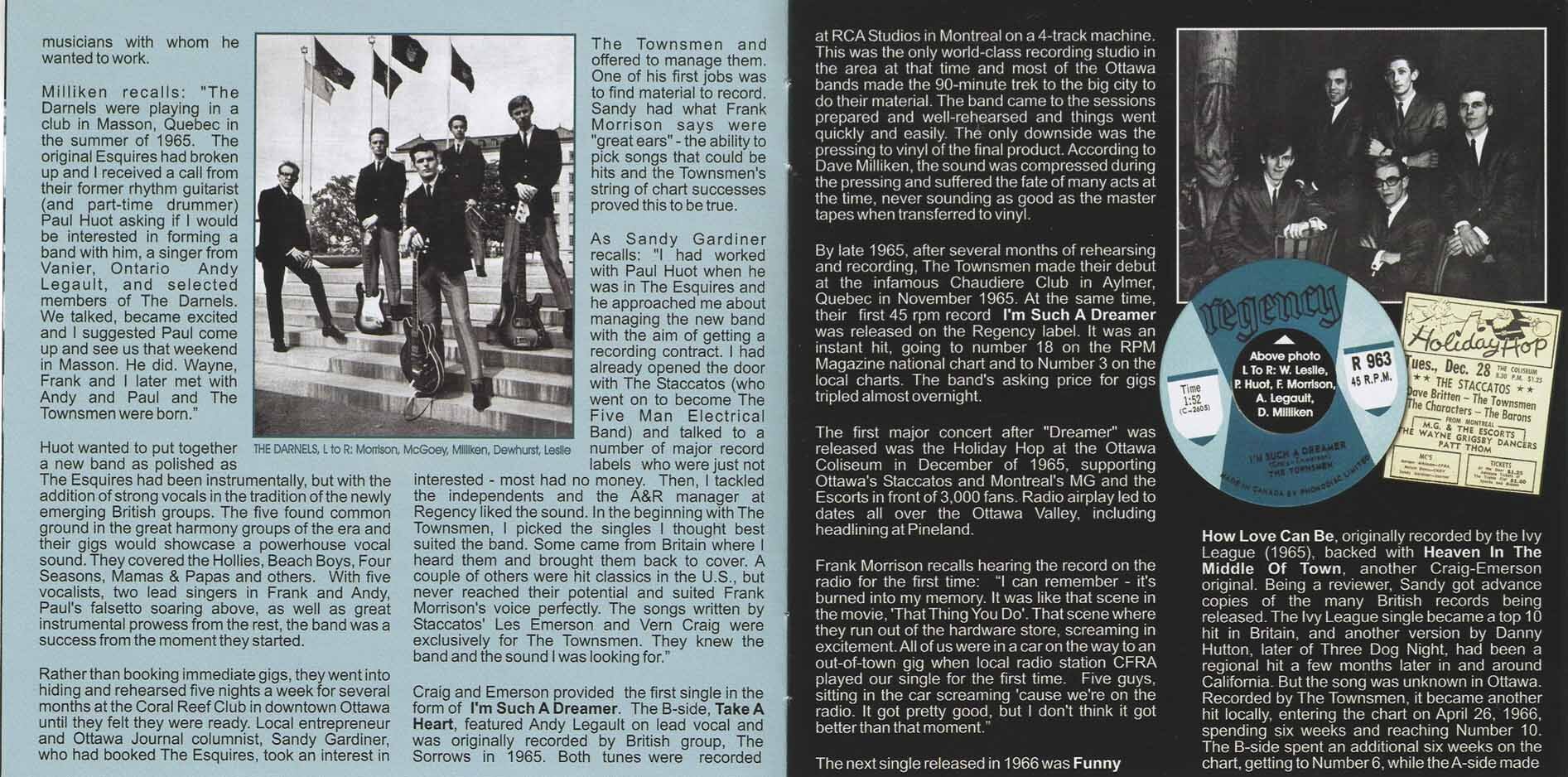 Local music columnist and promoter Sandy Gardiner, who had previously worked with The Esquires and The Staccatos, recognized the band’s potential and took on management duties. Gardiner’s instinct for repertoire proved crucial: he sourced songs that suited Morrison’s voice and the band’s harmonic strengths, including material written specifically for them by Les Emmerson and Vern Craig of The Staccatos. This partnership led directly to The Townsmen’s debut single, “I’m Such a Dreamer” b/w “Take a Heart,” released on Regency Records in late 1965. The record became an immediate success, climbing to number 18 on the national RPM chart and into the Top 3 locally, transforming the group almost overnight from a promising club act into one of Ottawa’s most in-demand bands.