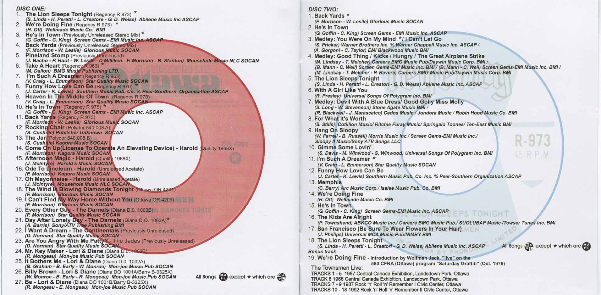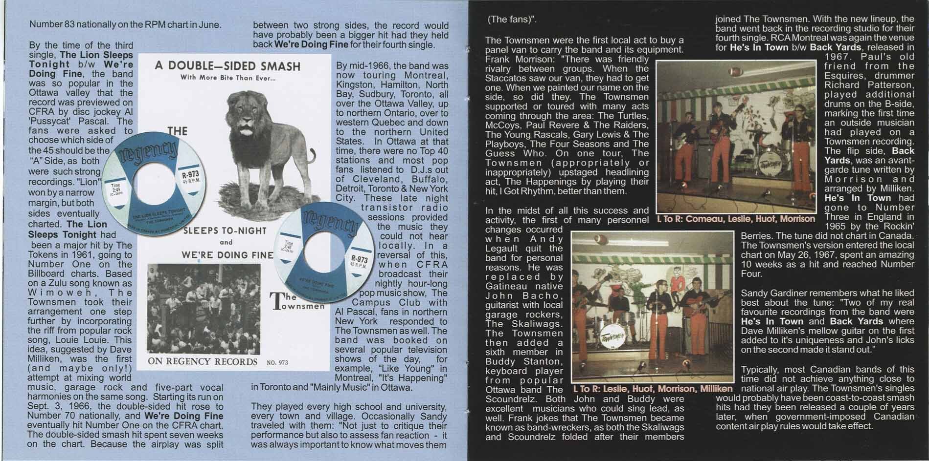 Throughout 1966 and 1967, The Townsmen maintained a steady recording and touring schedule, releasing a string of singles that kept them on Canadian radio while they worked relentlessly on the road. Follow-up releases such as “Funny How Love Can Be” b/w “Heaven in the Middle of Town,” the double-sided hit “The Lion Sleeps Tonight” b/w “We’re Doing Fine,” and “He’s in Town” b/w “Back Yards” reinforced their reputation as a reliable hit-making group with strong vocal arrangements and a confident, contemporary sound. Radio support—particularly from Ottawa stations like CFRA—played a key role in sustaining their profile, and the band toured widely across Ontario, Quebec, and into the northern United States, appearing at dance halls, universities, and major concerts. Highlights included high-profile shows such as Ottawa’s Holiday Hop, where they shared the bill with The Staccatos and Montreal’s MG and the Escorts before thousands of fans.
