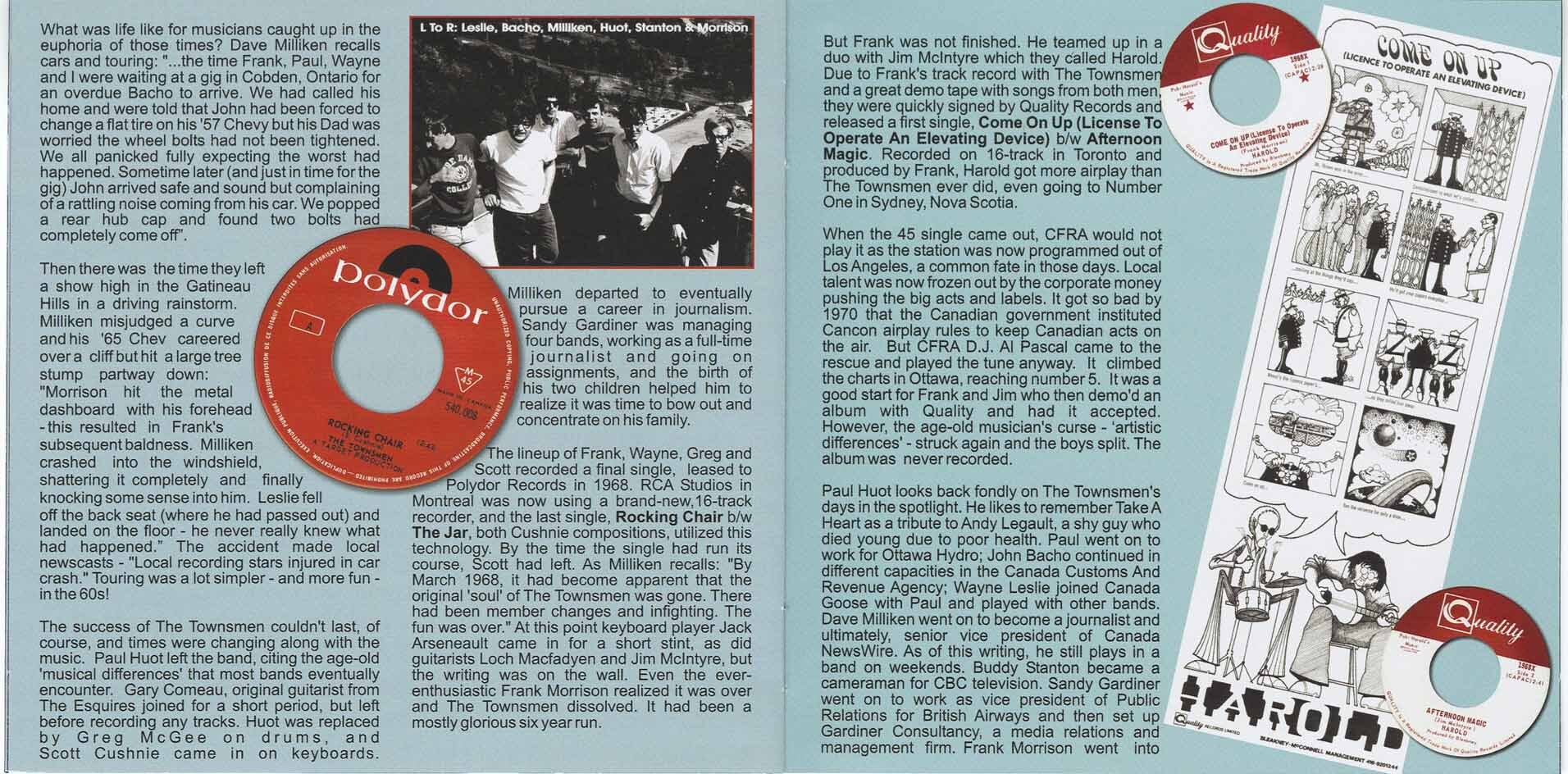 Like many successful bands of the era, The Townsmen experienced frequent lineup changes as touring pressures, shifting musical tastes, and personal circumstances took their toll. Andy Legault departed for health-related reasons and was later remembered fondly by bandmates, while Paul Huot eventually left citing musical differences. Other musicians passed through the group, including Gary Comeau, Buddy Stanton, John Bacho, Greg McGee, Scott Cushnie, Jim McIntyre, Loch MacFadyen, and Jack Arsenault, each contributing to different phases of the band’s evolution. By the time the group recorded their final single, “Rocking Chair” b/w “The Jar,” leased to Polydor Records in 1968 and recorded on then-new 16-track equipment at RCA Studios in Montreal, the original cohesion that had driven their early success had largely dissipated.