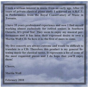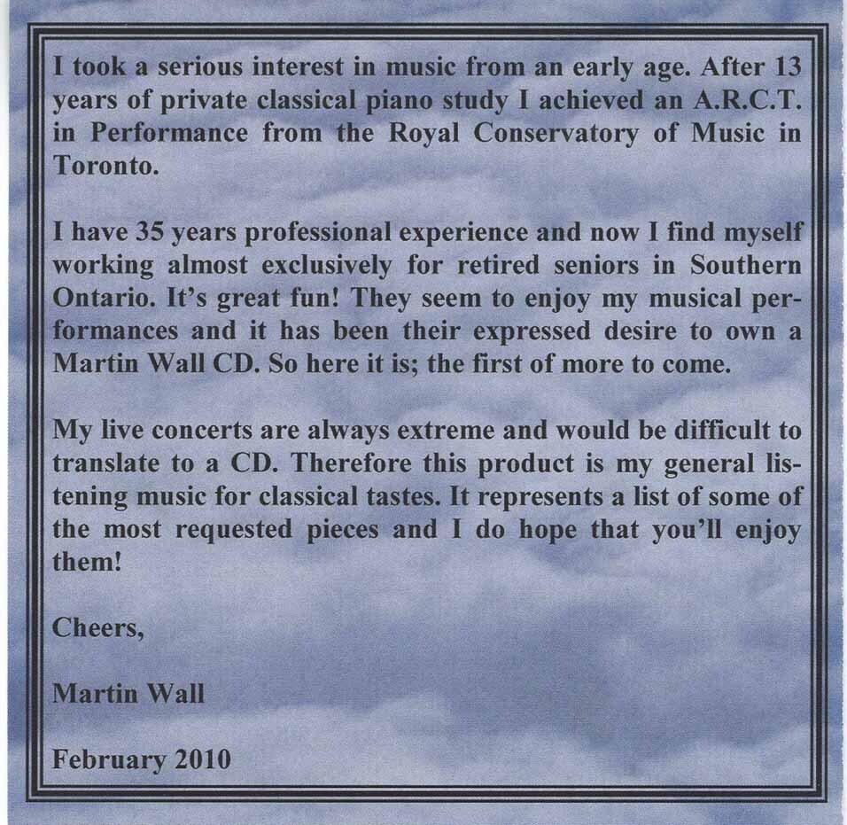 Martin Wall, a native of Hamilton, Ontario is a classically trained and very talented Canadian piano entertainer. He has worked across North America, Europe and in the Caribbean. A big fan of rock music, Martin's repertoire consists of Bach, Beethoven, Mozart, Chopin, Frank Sinatra, The Beatles, Queen, U2, Toto, Nirvana, Ragtime or anything else that pays money. Martin has also worked as a recording engineer, a record producer, a song writer, a classical composer and arranger, a church organist and even a choir master. "I make Hip Hop beats. I explore mountains. I experiment heavily with my mind and I trip the light fantastic. Do not be afraid. I come in peace." This album is Martin's first album since his famous 'Metaphysical Facelift" album, which was released privately way back in 1977.