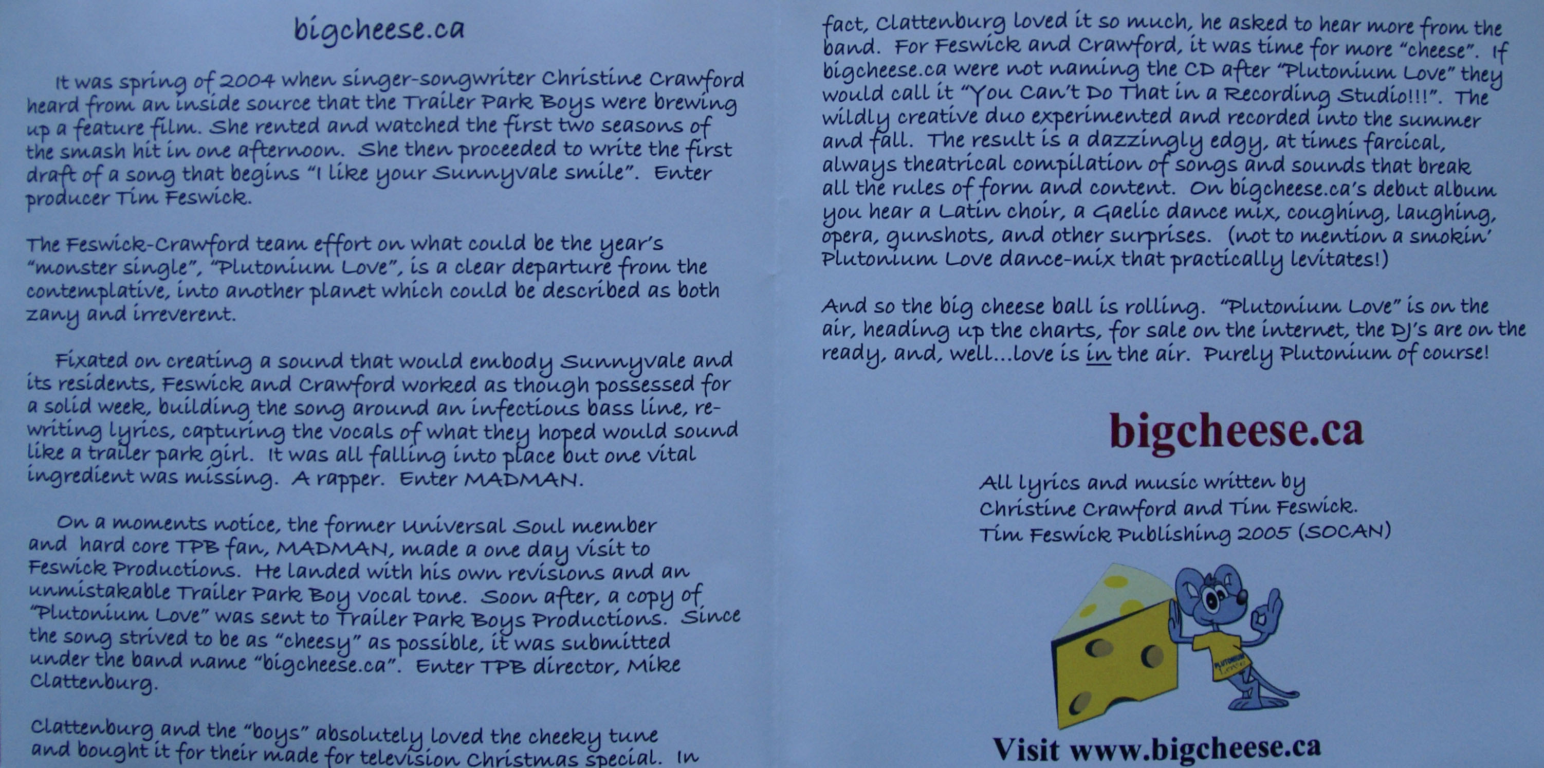 The Band bigcheese.ca was formed in Halifax, Nova Scotia. Christine Crawford, producer Tim Feswick, and rapper 'Madman' heard there was a Trailer Park Boys made for TV movie in the works so they decided to write something for the show that captured the essence of the show. The song "Plutonium Love" was written and submitted to the show's director Mike Clattenburg. Mike added the song to the soundtrack. The song was also featured in the Television show about the Trailer Park Girls called 'Hearts of Dartmouth'.