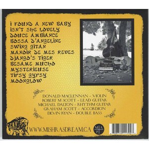 Paying homage to Gypsy Jazz legend Django Reinhardt are Antigonish's Mishra's Dream. From soaring gypsy ballads to hot jazz standards, the versatility and energy of this acoustic quintet keeps audiences mesmerized and their dancing shoes hot on the floor. With two guitars, a violin, a stand-up bass and an accordion, Mishra's Dream brings to life the style of French jazz made famous by guitarist Django Reinhardt and violinist Stephane Grappelli, while including other gypsy standards from various backgrounds. Mishra's Dream boasts a following both young and old, and are in high demand for many different functions and events, from wedding receptions to cafes, campfire jams to corporate events.