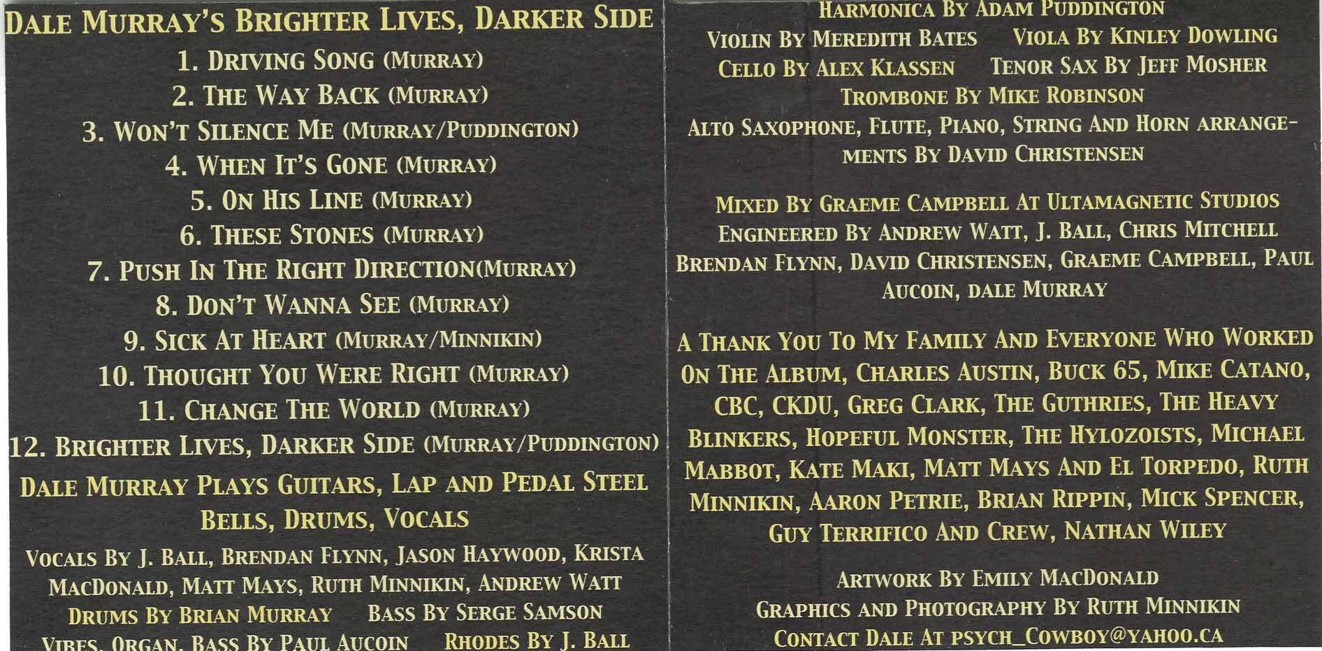 With the Guthries spread far and wide across the country’s music scene, songwriter/pedal steel player Dale Murray continues the band’s roots rock approach on his debut solo album. Brighter Lives, Darker Side happily cribs from some of the best and Murray’s influences arrive from far and wide. His love for country is still apparent on songs like “Don’t Wanna See” and Liverpudlian harmonies abound on intro pop-rocker “Driving Song,” “On His Line” and “When It’s Gone.” In fact, Murray is at his most comfortable channelling the quiet Beatle with Harrison slide licks adorning a couple of the album’s stronger tunes such as “The Way Back.” He breaks out a mean fuzz box to scare away TV preachers on “Don’t Wanna See” and are those Manhattan Transfer back-ups on “Thought You Were Right”? The lyrics never quite reach the class of his melodies, instrumentation and production, but on those last three points, Brighter Lives scores all tens.