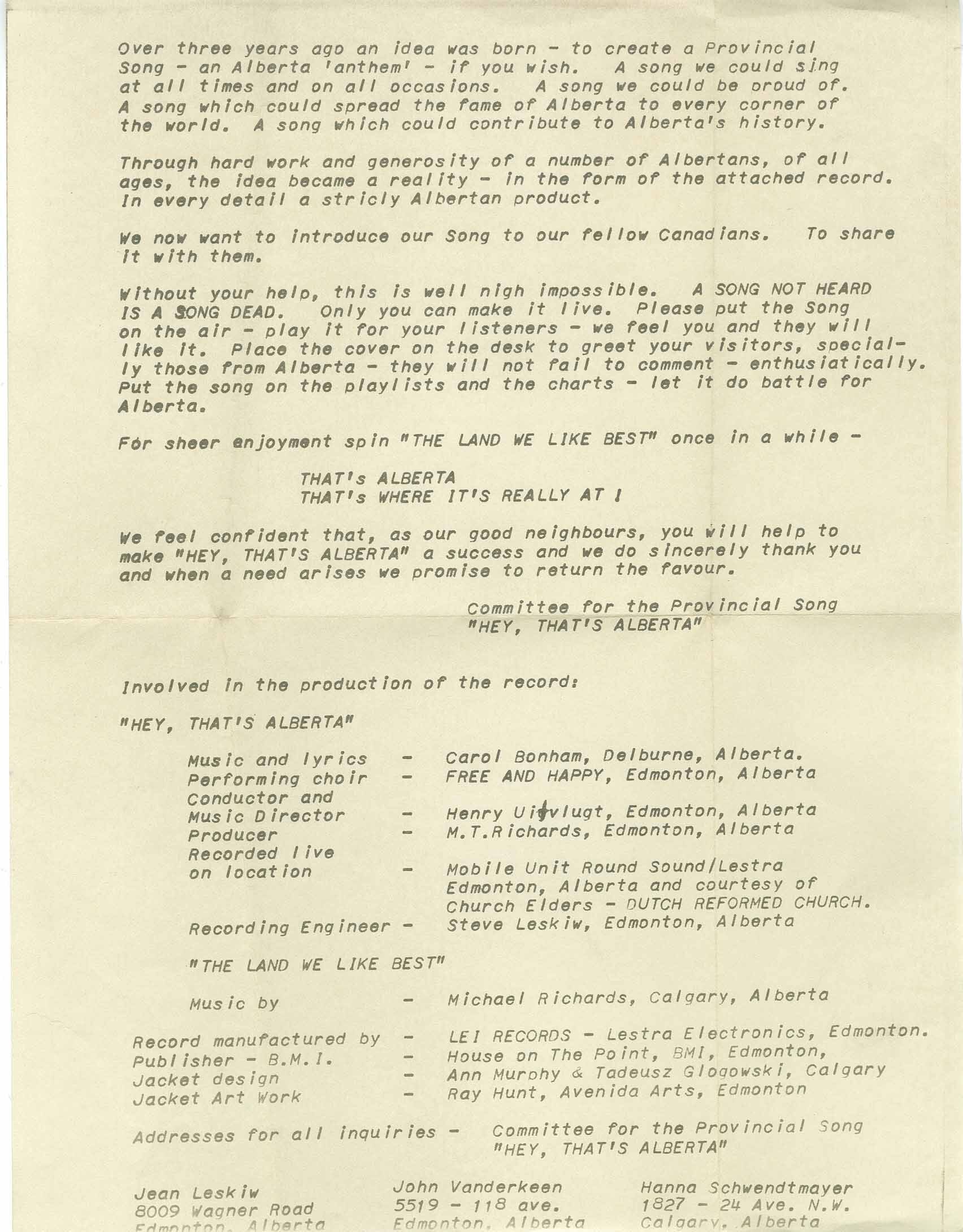 Record manufactured by Lei Records, Lestra Electronics, Edmonton